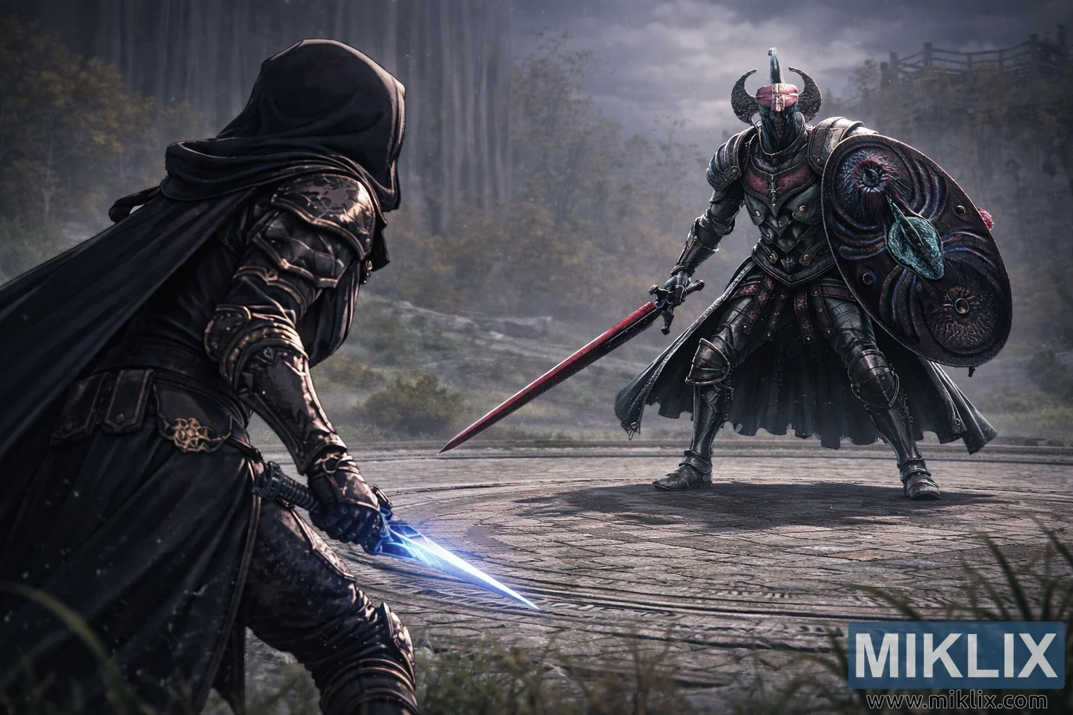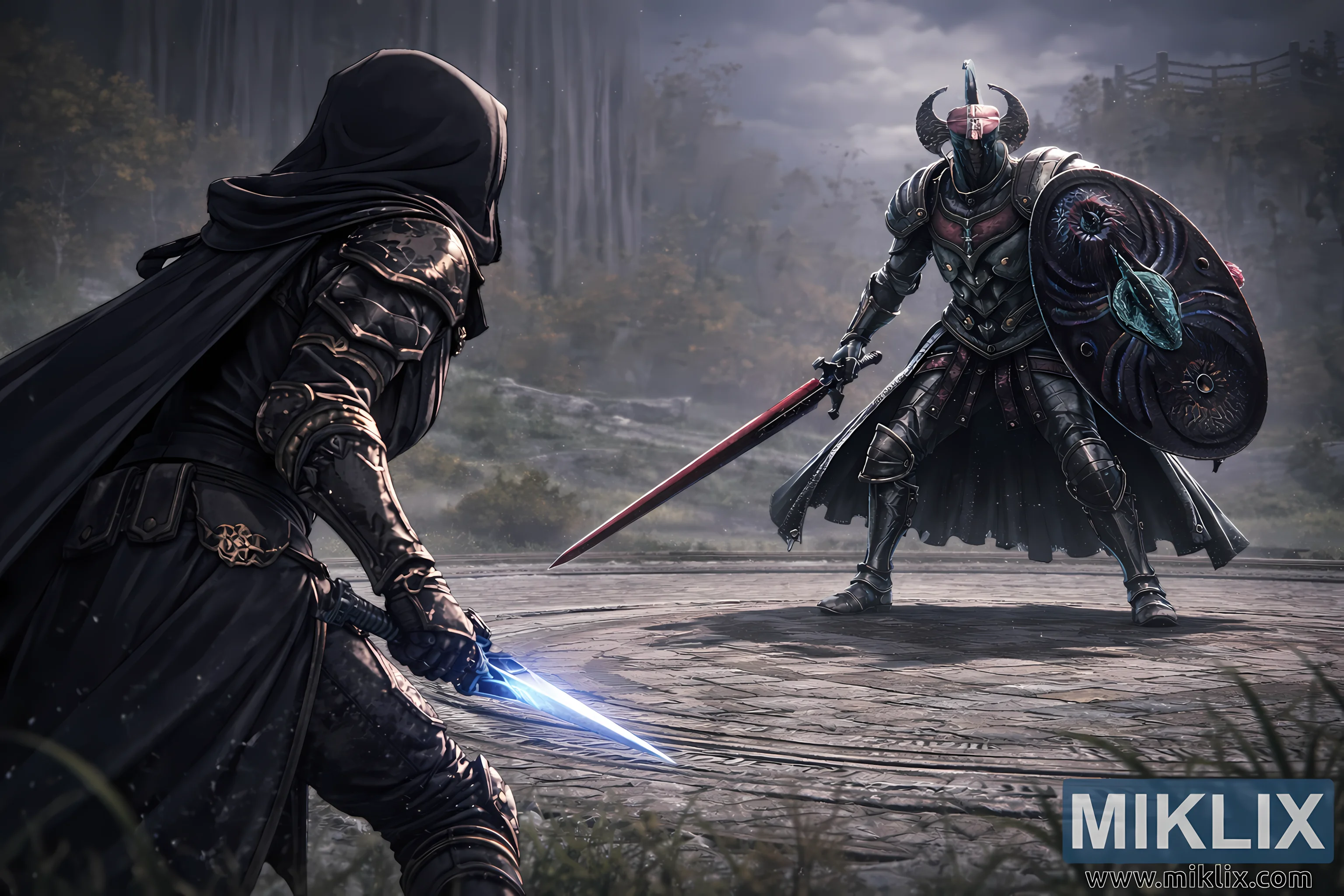 The distance between the two combatants is deliberate and charged with anticipation. Neither has struck yet; instead, both advance slowly, measuring one another in silence. The contrast in scale, posture, and weaponry underscores the imbalance of power, while the careful composition captures the calm before inevitable violence. Overall, the image conveys a powerful sense of tension, resolve, and epic confrontation, embodying the dark fantasy atmosphere and emotional weight characteristic of Elden Ring.