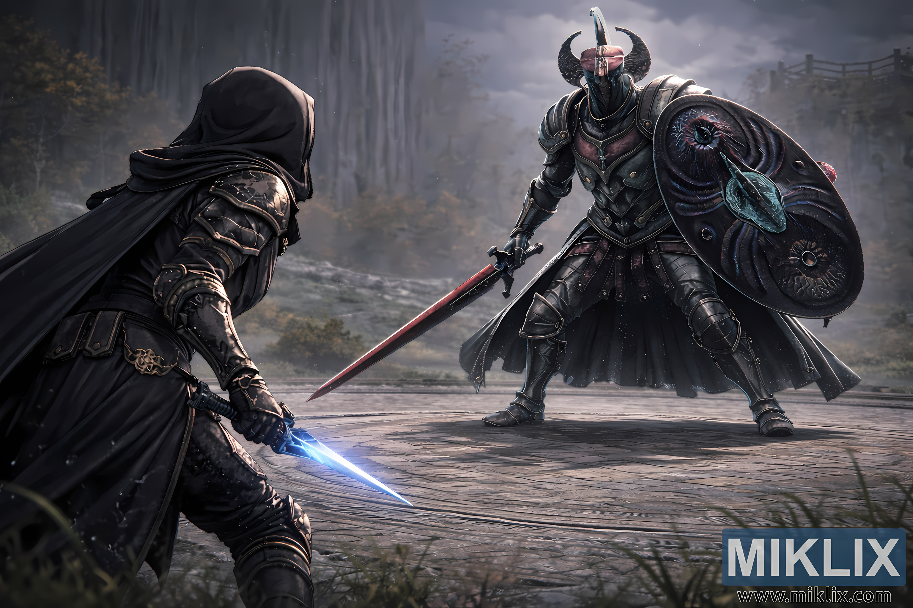 Towering over the scene on the right side of the frame stands the Crucible Knight, now depicted as significantly larger and more imposing than before. The knight’s massive build and elevated stance dominate the composition, reinforcing its overwhelming presence. Heavy, ancient armor encases the figure, composed of thick, overlapping plates with ornate engravings and a dark, weathered finish. A horned helm crowns the Crucible Knight, creating a brutal, mythic silhouette that looms against the misty backdrop. In one hand, the knight grips a long sword glowing faintly red, angled downward yet clearly ready to rise with explosive force. In the other, a large round shield is held forward, its surface adorned with unsettling, organic patterns and eye-like motifs that give it an almost living quality.