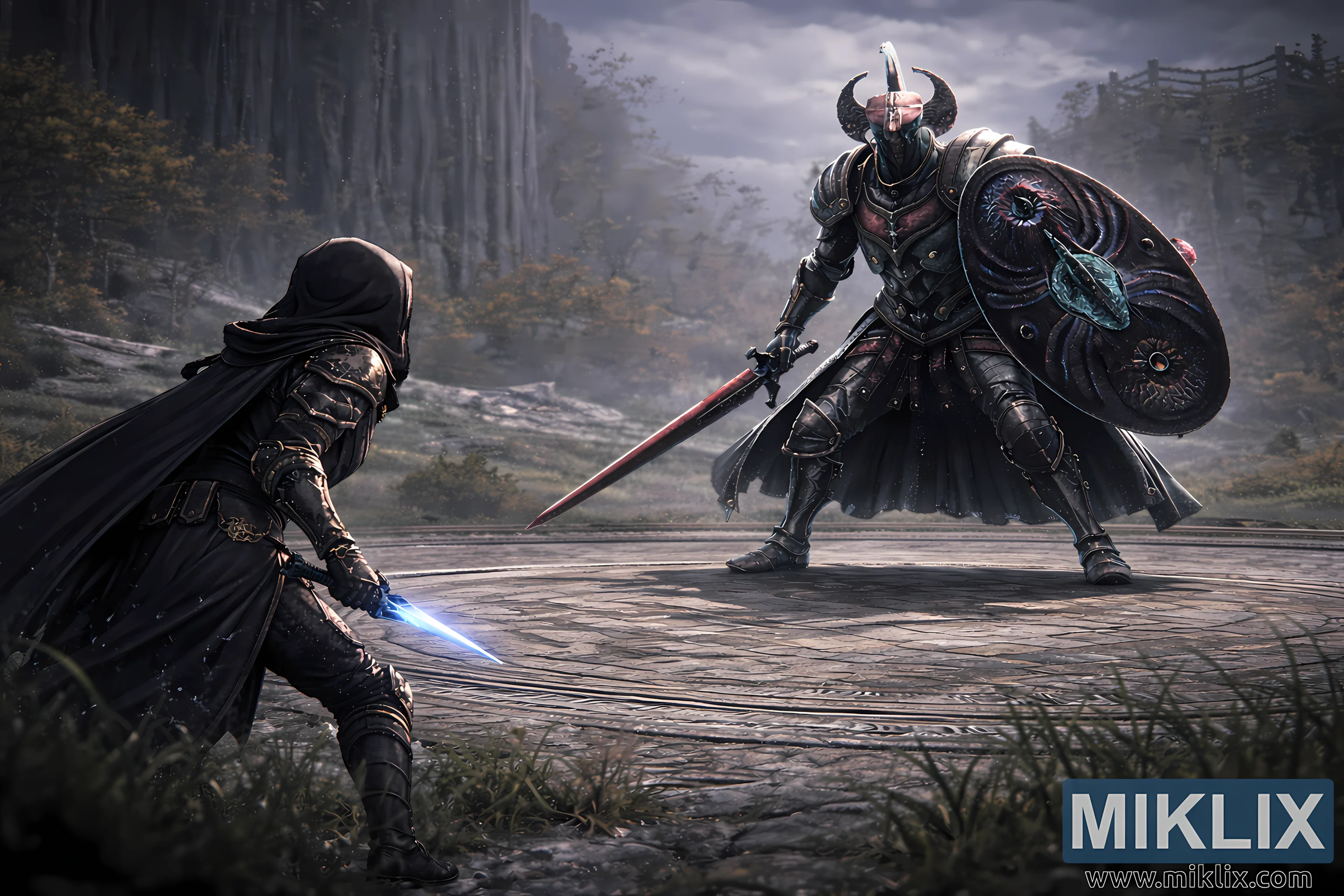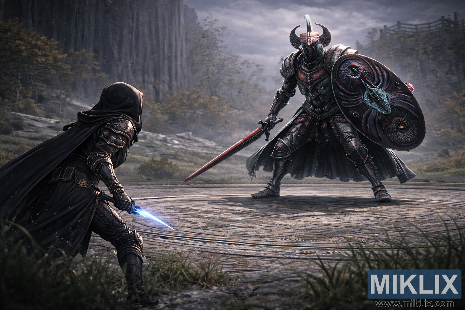 The expanded background adds depth and atmosphere to the scene. The circular Evergaol arena is fully visible, its concentric stone rings worn smooth by time and past conflicts. Tufts of grass and creeping vegetation push through cracks along the edges, softening the harsh geometry of the stone. Beyond the arena, mist drifts across rolling ground and rocky outcroppings, while blurred trees, cliffs, and towering stone walls fade into the distance. Diffuse, overcast light filters down from above, casting soft highlights on armor and weapons while leaving deep shadows beneath cloaks and shields.