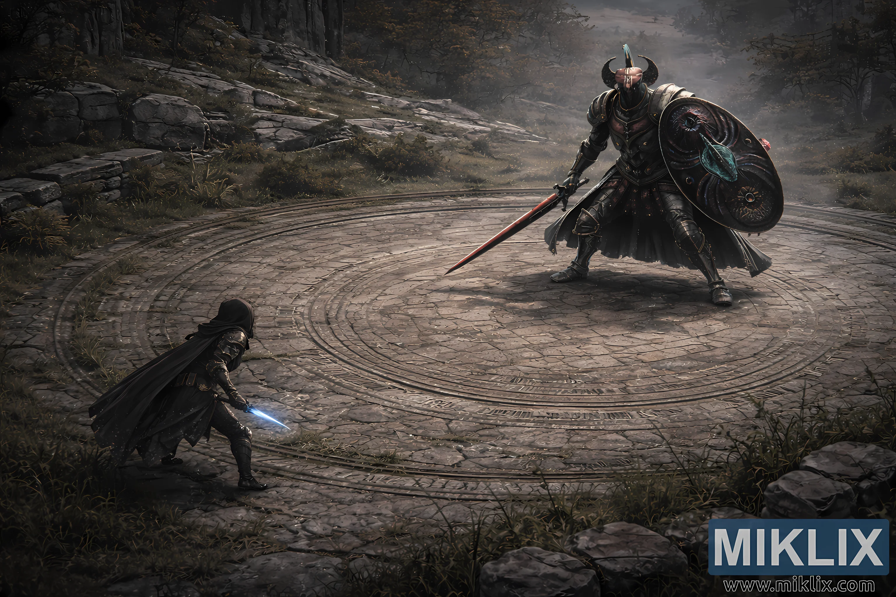 The environment plays a major role in the composition. The Evergaol arena is fully visible, its concentric stone rings forming a natural focal point that draws the eye inward toward the confrontation. Cracks in the stone allow grass and weeds to emerge, breaking the symmetry and hinting at long abandonment. Beyond the arena, rocky slopes, scattered shrubs, and sparse trees fade into mist. Cliff faces and rough stone formations frame the scene, while diffuse, overcast light softens shadows and removes harsh contrast, reinforcing the somber mood.