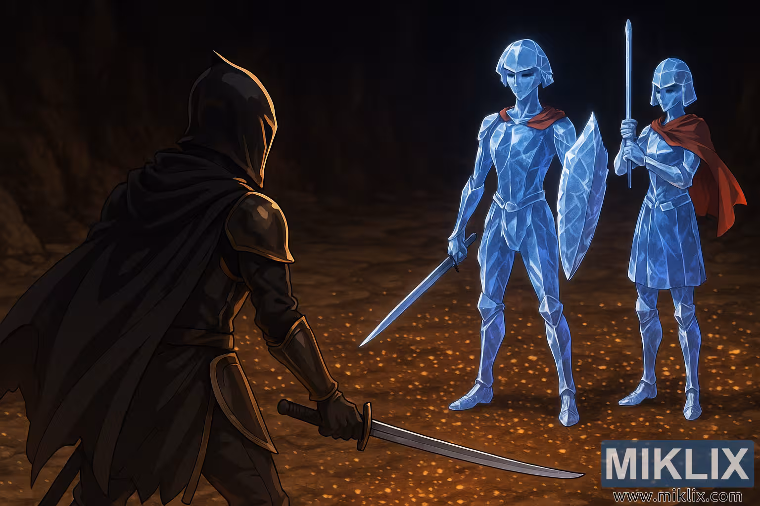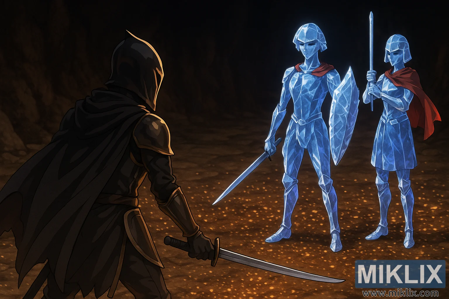 The cavern itself feels expansive yet suffocating, with its dark, uneven walls receding into shadow. The ground is scattered with flecks of gold, glowing faintly like embers trapped within stone, casting a warm illumination that contrasts with the cold blues of the Crystalians. The lighting heightens the sense of confrontation—warmth behind the Tarnished, cold danger before him.