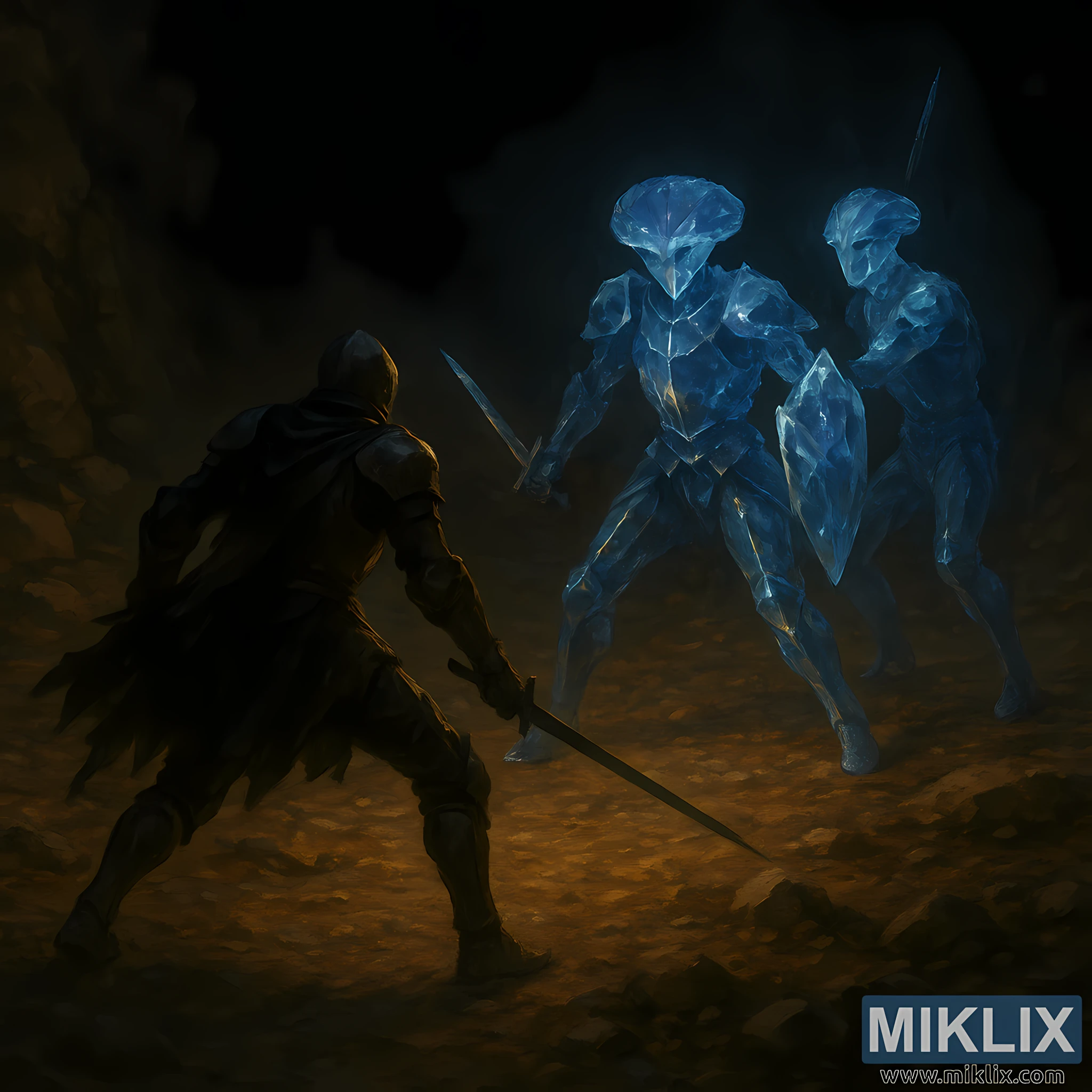 Image: Tarnished Engages Crystalians in a Realistic Cavern Battle