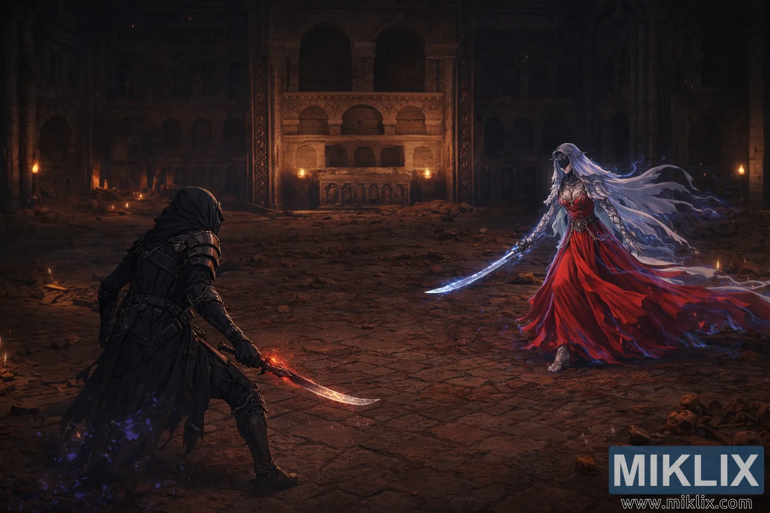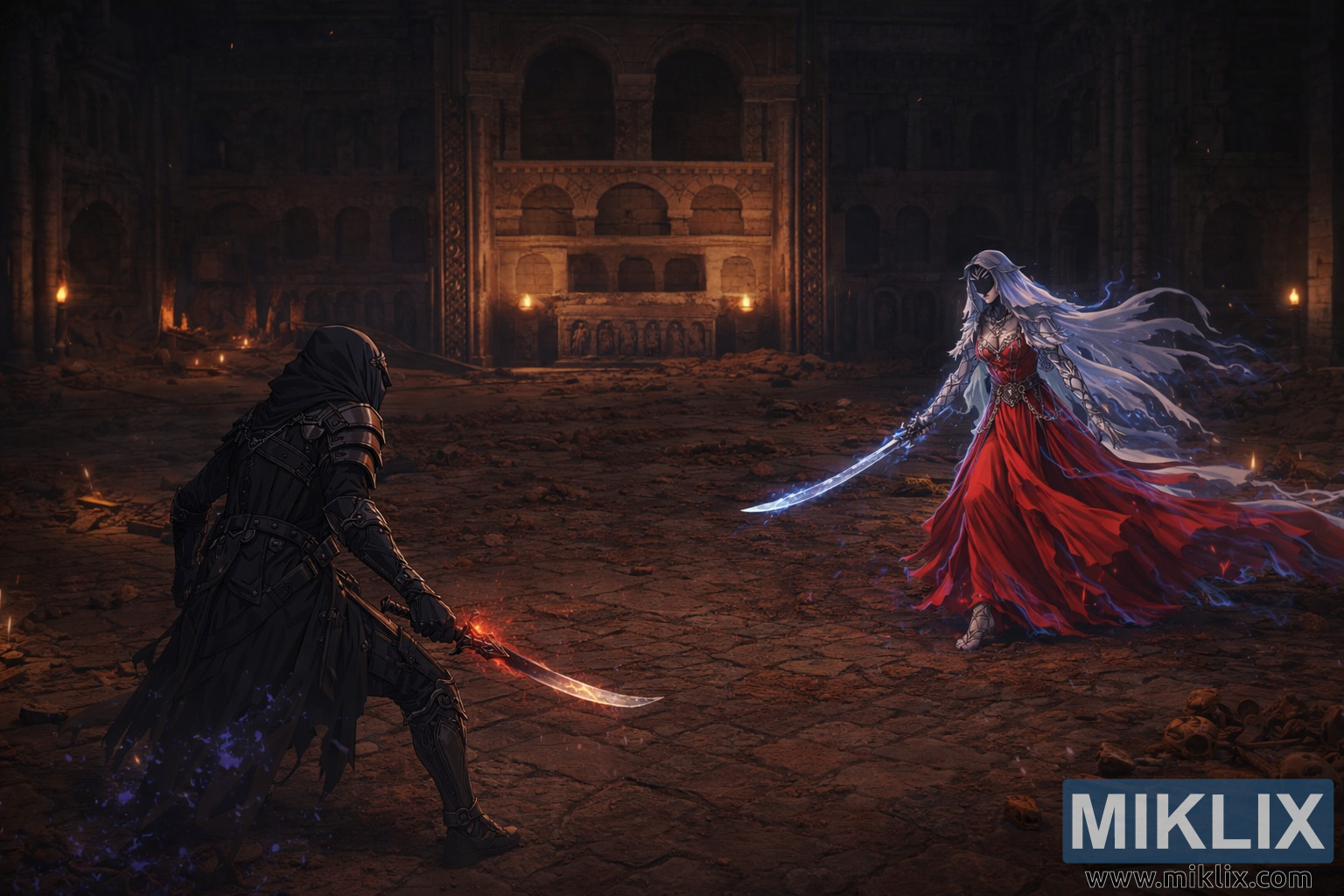 The Dancer’s curved blade shines with cold, blue light, crackling softly with arcane energy that traces along its edge and spills into the surrounding air. Her face remains partially obscured by a dark, mask-like covering, rendering her expression unreadable and lending her a ceremonial, almost ritualistic presence. The increased distance between the two figures heightens the sense of anticipation, emphasizing the space they must cross before blades meet.