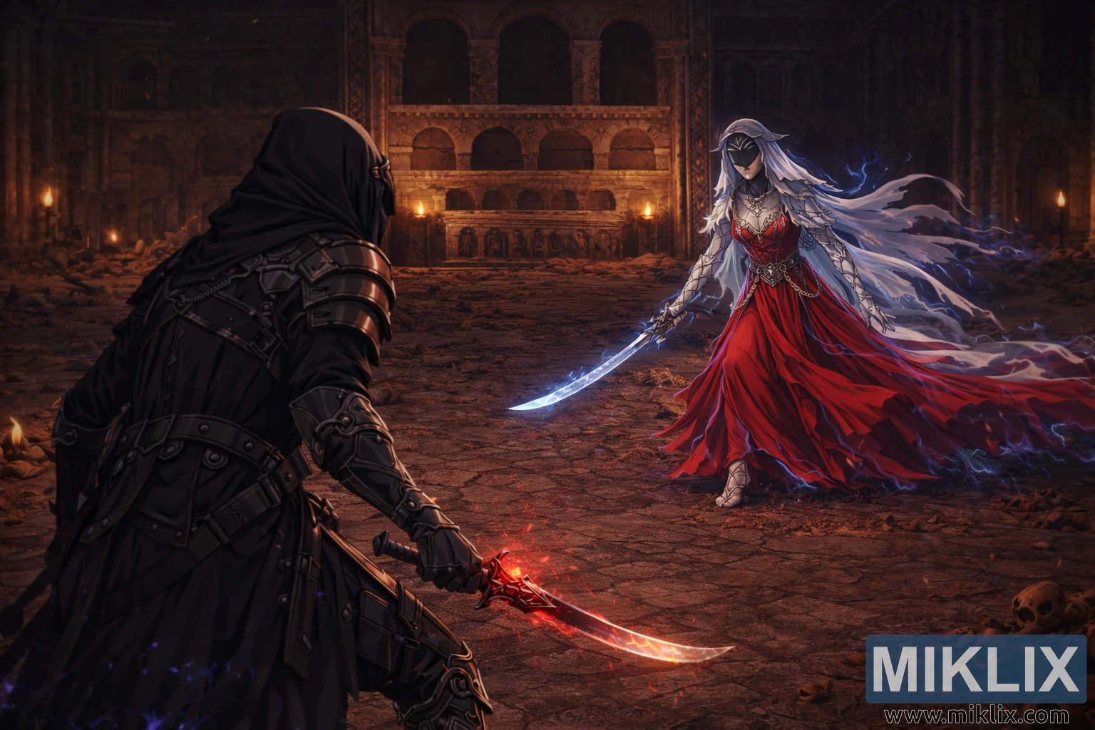 The Dancer wields a long, curved blade radiating icy blue light. Arcane energy crackles softly along its edge, casting cool highlights onto the surrounding floor and her armor. Her face remains partially hidden behind a dark, mask-like covering, rendering her expression unreadable and lending her an emotionless, ritualistic presence.