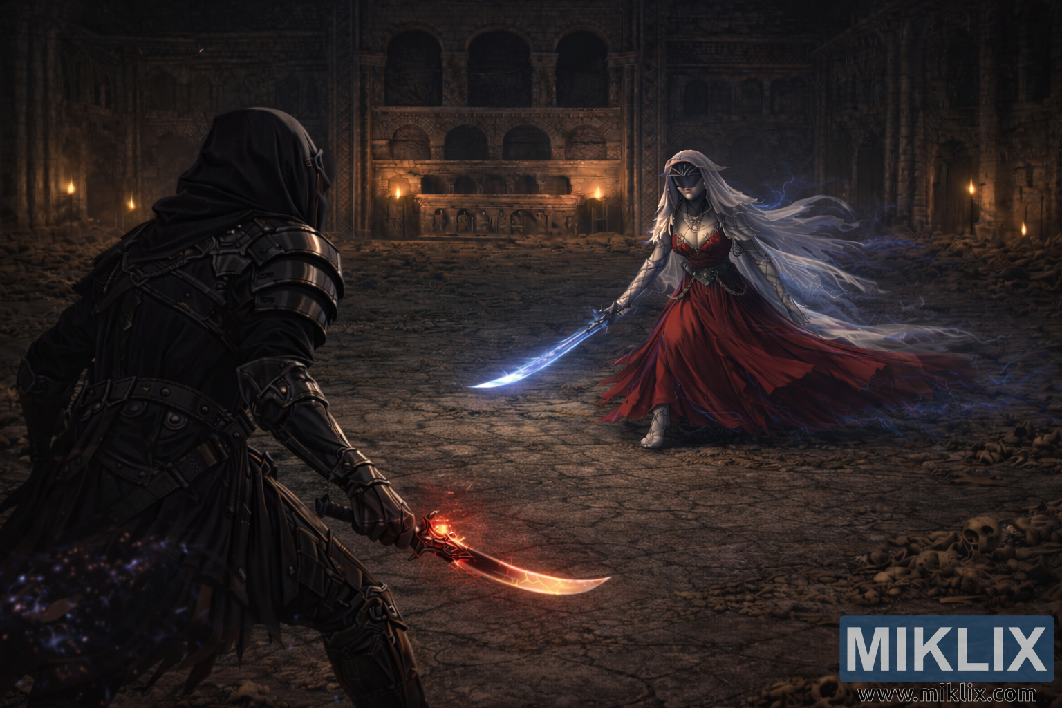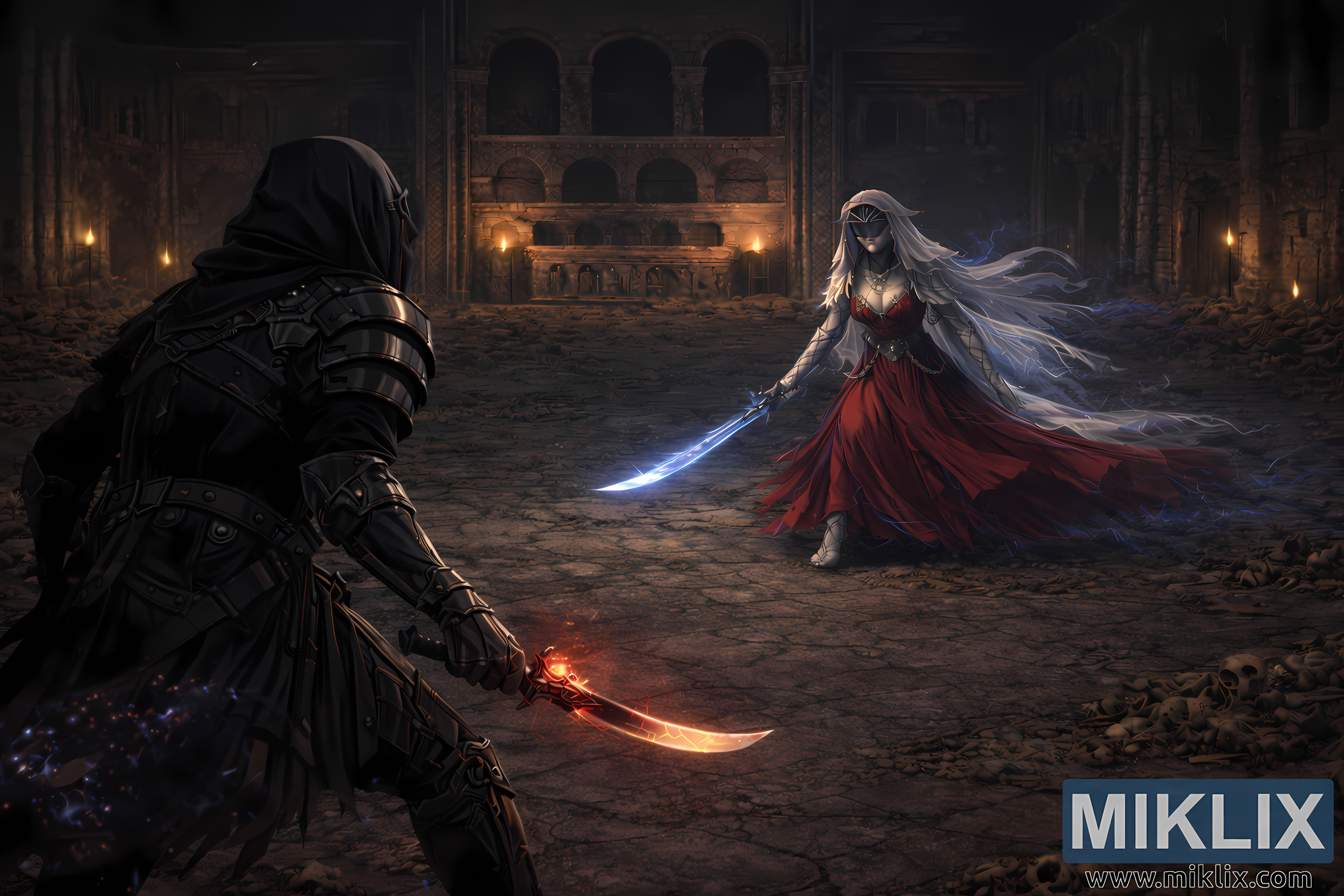 Opposite the Tarnished, now standing closer while the camera remains pulled back, is the Dancer of Ranah. Her presence is elegant but unsettling. She hovers lightly above the ground, her movement restrained and deliberate rather than exaggerated. A cold, blue spectral aura clings to her form like mist, trailing faint arcs of arcane energy. Beneath this aura, her red dress is clearly visible, its fabric heavy and layered, flowing naturally with gravity and motion. The deep red color contrasts sharply with the muted stone surroundings, symbolizing danger and vitality. Metallic filigree and armor accents are finely detailed but restrained, catching occasional highlights from torchlight and magical glow.
