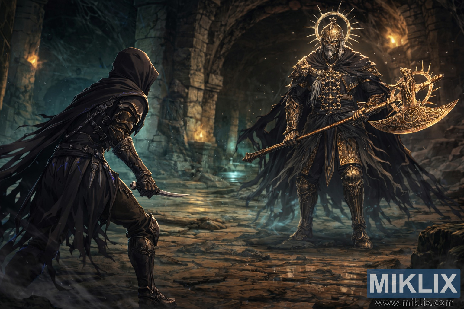 Between them lies a stretch of broken stone floor scattered with pebbles and shallow puddles. These small reflective surfaces mirror fragments of the golden halo and the Tarnished’s blue accents, visually binding the two enemies together in the same ominous fate. In the background, tall archways recede into darkness, their depths obscured by drifting dust and fog, implying that countless forgotten battles may have taken place here before.