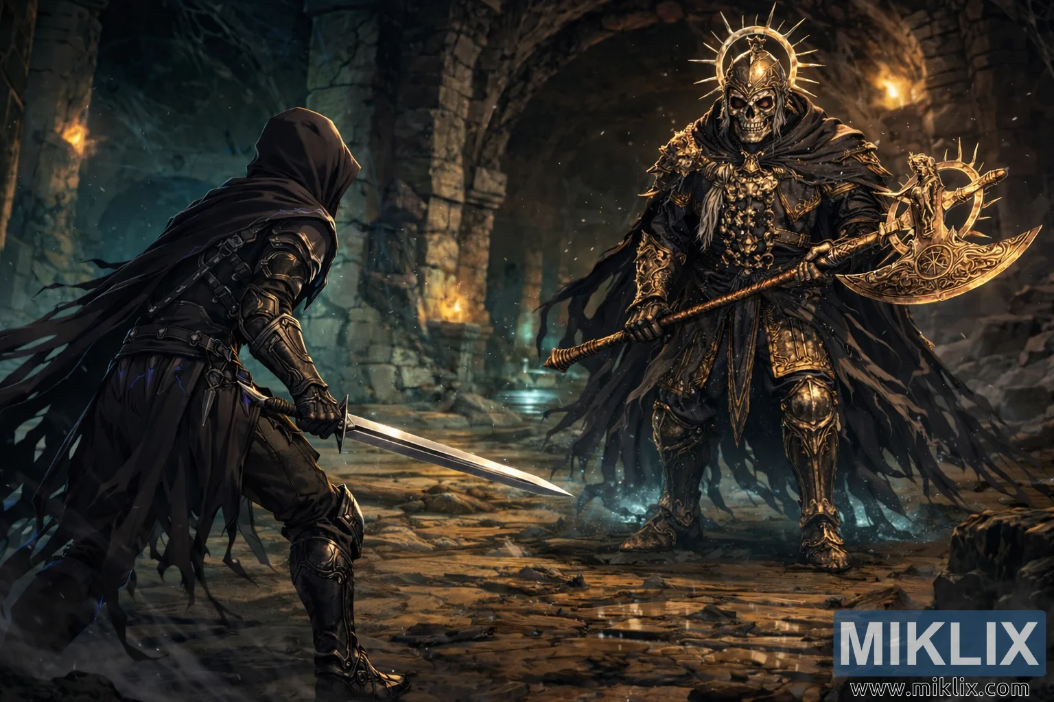 Between these two figures lies a short stretch of broken stone floor, scattered with rubble and shallow pools that mirror fragments of their light: the Tarnished’s cold blue glimmer and the Death Knight’s burning gold halo. The environment feels ancient and oppressive, yet suspended in time, as if the catacombs themselves are holding their breath. Nothing has moved yet, but every detail screams that motion is inevitable. It is the instant before the clash, when resolve meets damnation, and the silence is louder than any scream.