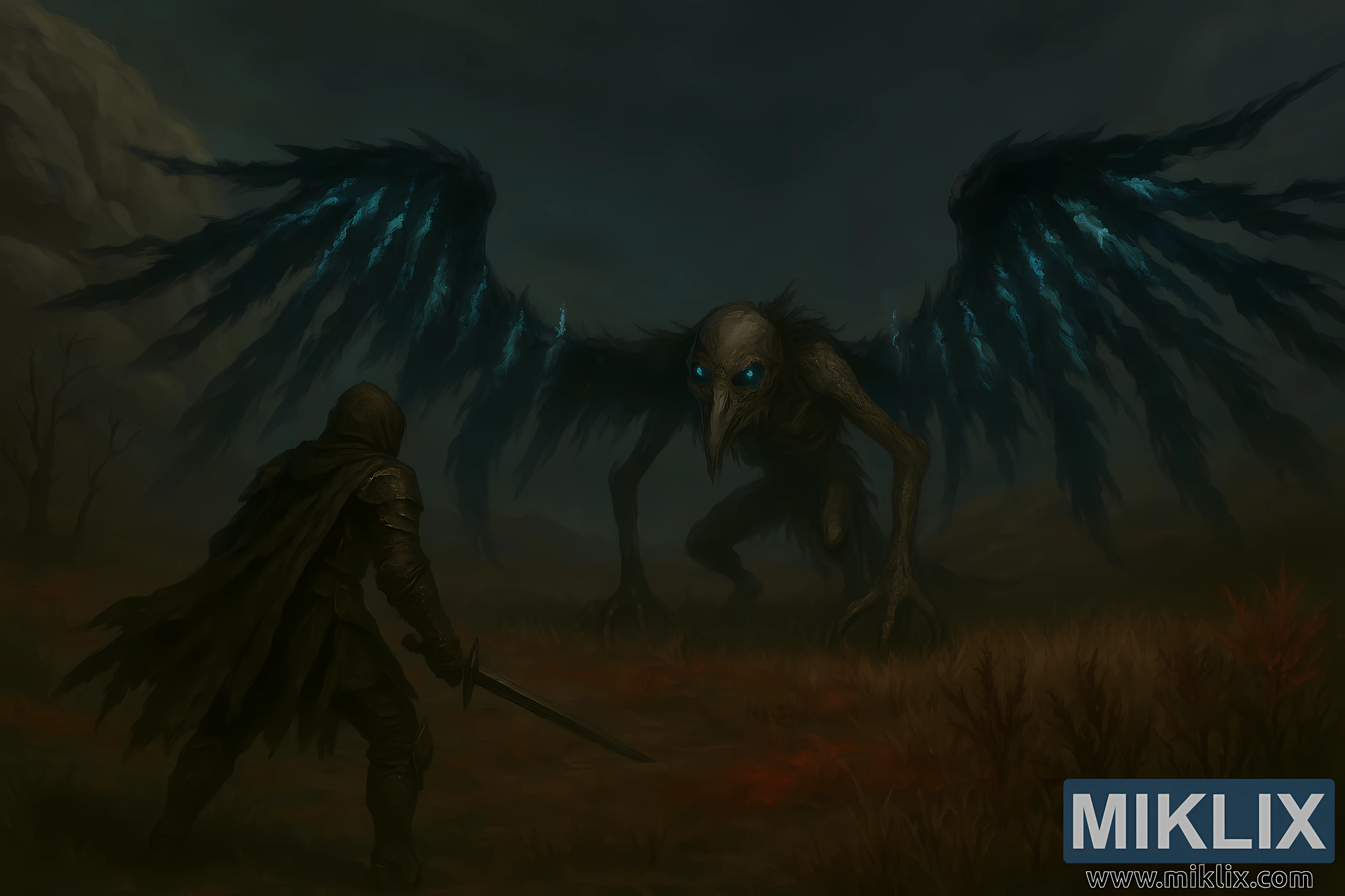 Opposite him looms the Death Rite Bird, a grotesque and skeletal avian creature with a gaunt, corpse-like body. Its elongated skull-like head features glowing, icy blue eyes that pierce through the gloom. The creature’s wings are vast and jagged, composed of tattered black feathers that crackle with streaks of blue-white magical energy, resembling lightning bolts. These ethereal streaks arc outward, casting ghostly illumination across the battlefield. Its limbs are long and bony, ending in talons that dig into the brittle, reddish-brown grass.