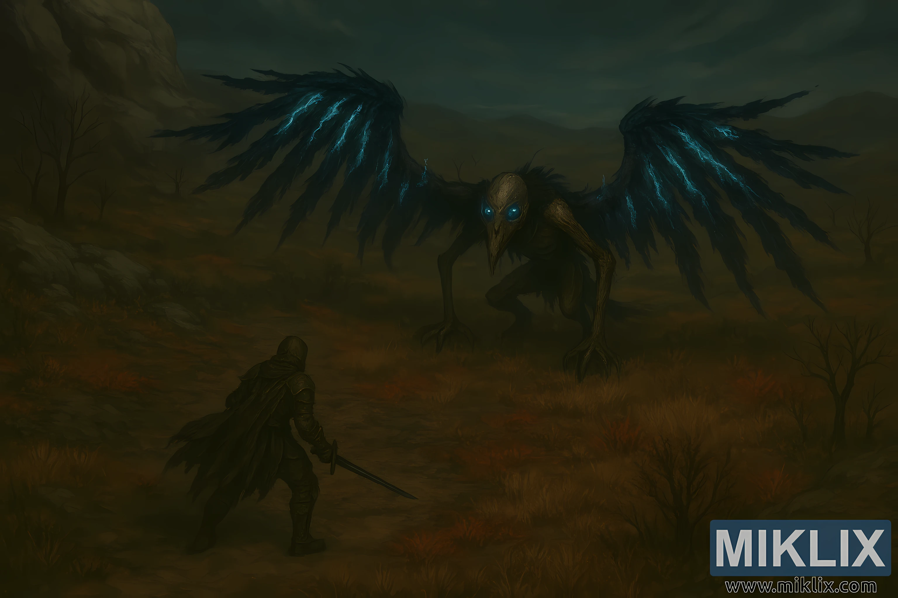 On the right side looms the Death Rite Bird, rendered with unsettling realism. Its skeletal frame is gaunt and elongated, with skin stretched tightly over bone, giving it a corpse-like, almost mummified appearance. The creature’s skull-like head tilts forward, its hollow eye sockets illuminated by an icy blue glow that cuts through the murk. Its wings are vast and jagged, composed of tattered black feathers that crackle with streaks of blue-white magical energy. These arcs of light ripple across the wings like living lightning, casting ghostly illumination across the battlefield and creating stark contrasts of shadow and glow. The creature’s talons dig into the brittle, reddish-brown grass, anchoring it in a predatory stance as it prepares to strike.