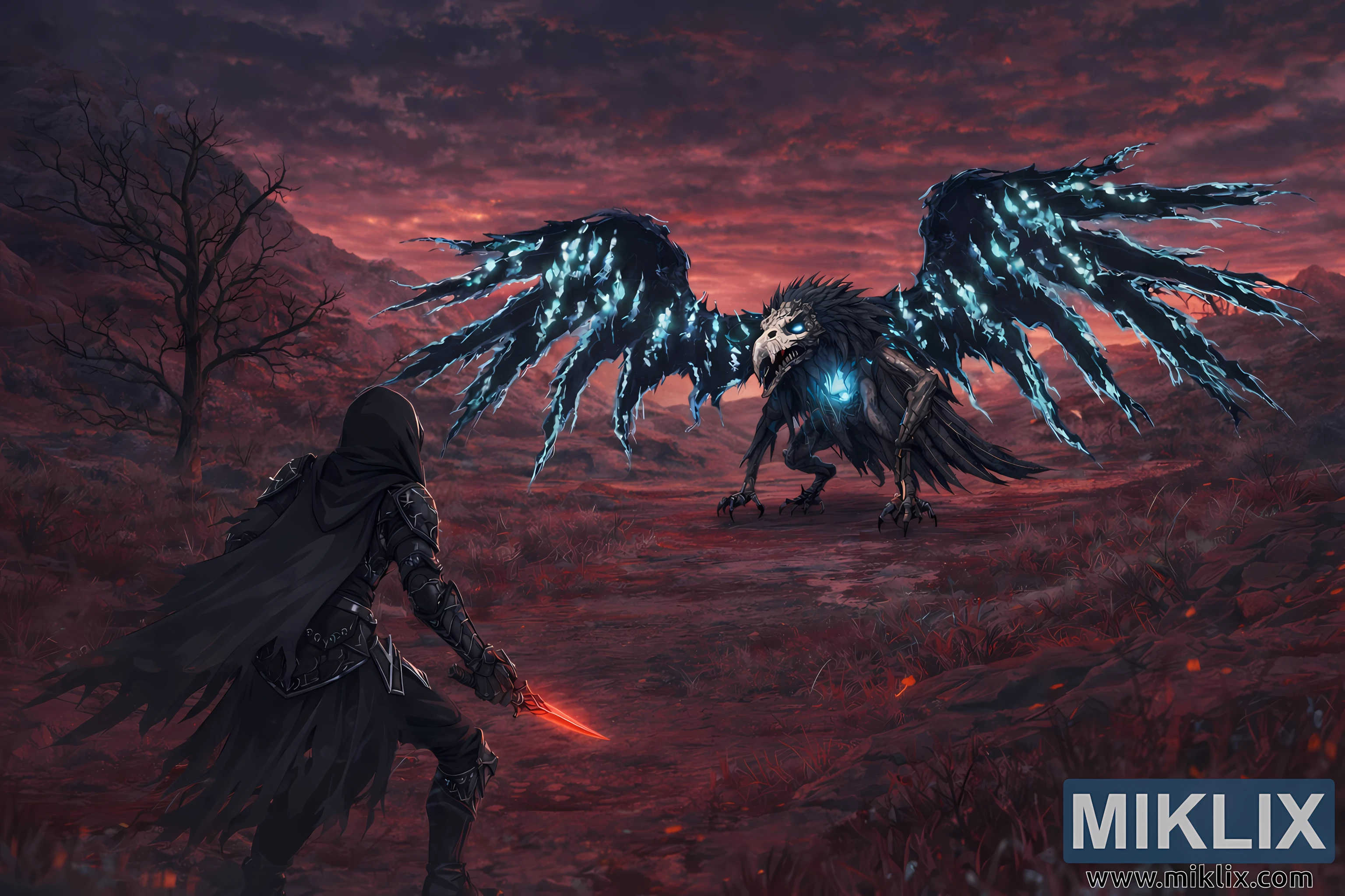 The broader view heightens the contrast between the two figures and their environment. Warm reds and burnt oranges of the corrupted land clash with the chilling blues of necromantic energy radiating from the Death Rite Bird. The sky churns with layered clouds, painted in bruised purples and blood-soaked crimsons, as though the heavens themselves are bearing witness to the confrontation. Despite the scale of the landscape, the moment remains eerily silent — a suspended heartbeat in which both hunter and prey measure distance, intent, and resolve before the chaos of battle erupts across the cursed plains of Caelid.
