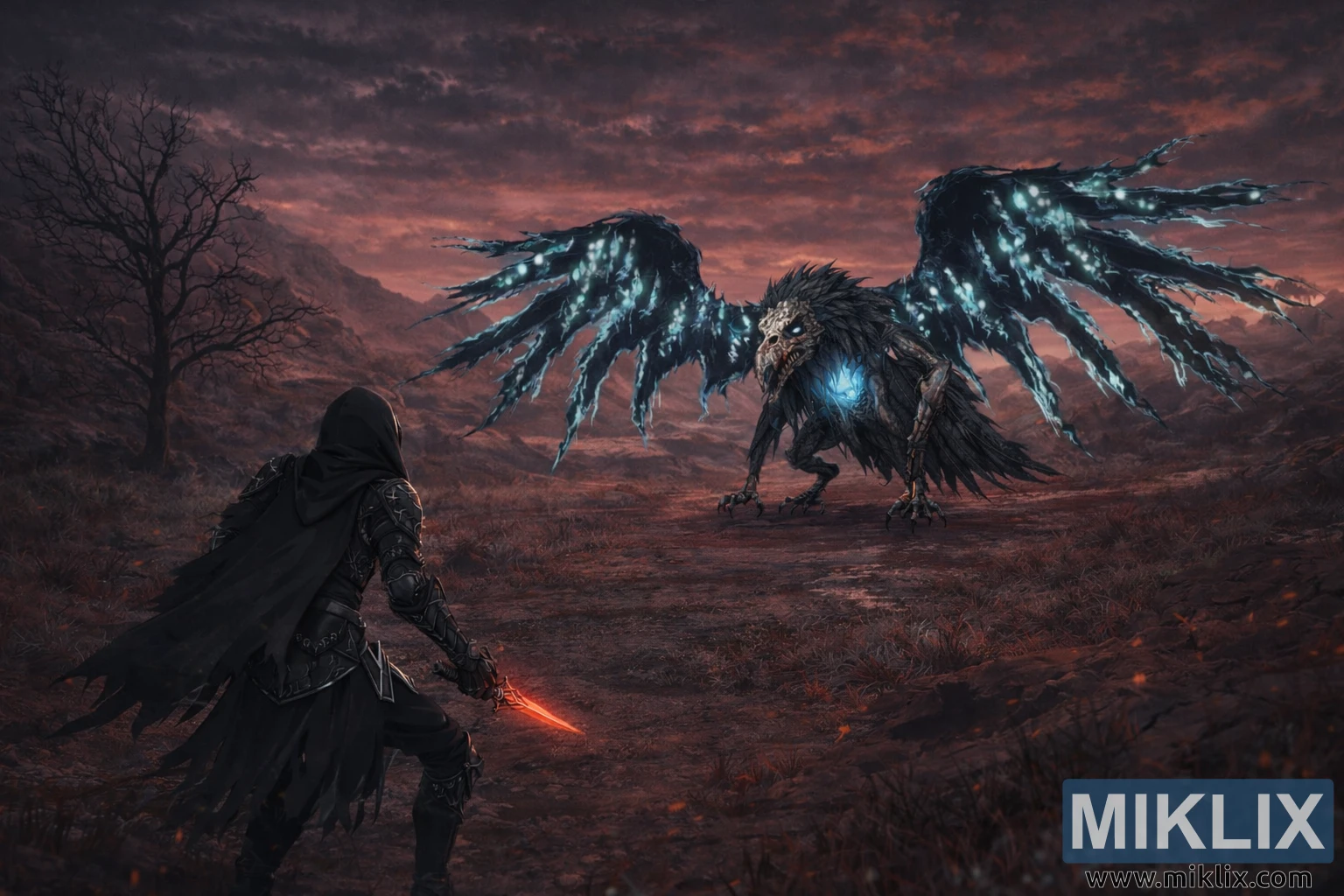 The color palette is restrained and brutal. The land bleeds with deep reds and browns, the sky hangs in oppressive purples and soot-dark grays, and the only sharp contrast comes from the Death Rite Bird’s corpse-blue light and the Tarnished’s smoldering blade. There is no exaggeration or theatrical flourish here — only a suffocating stillness, a moment of grim realism where two doomed beings stand on the brink of violence in a world that has already forgotten mercy.