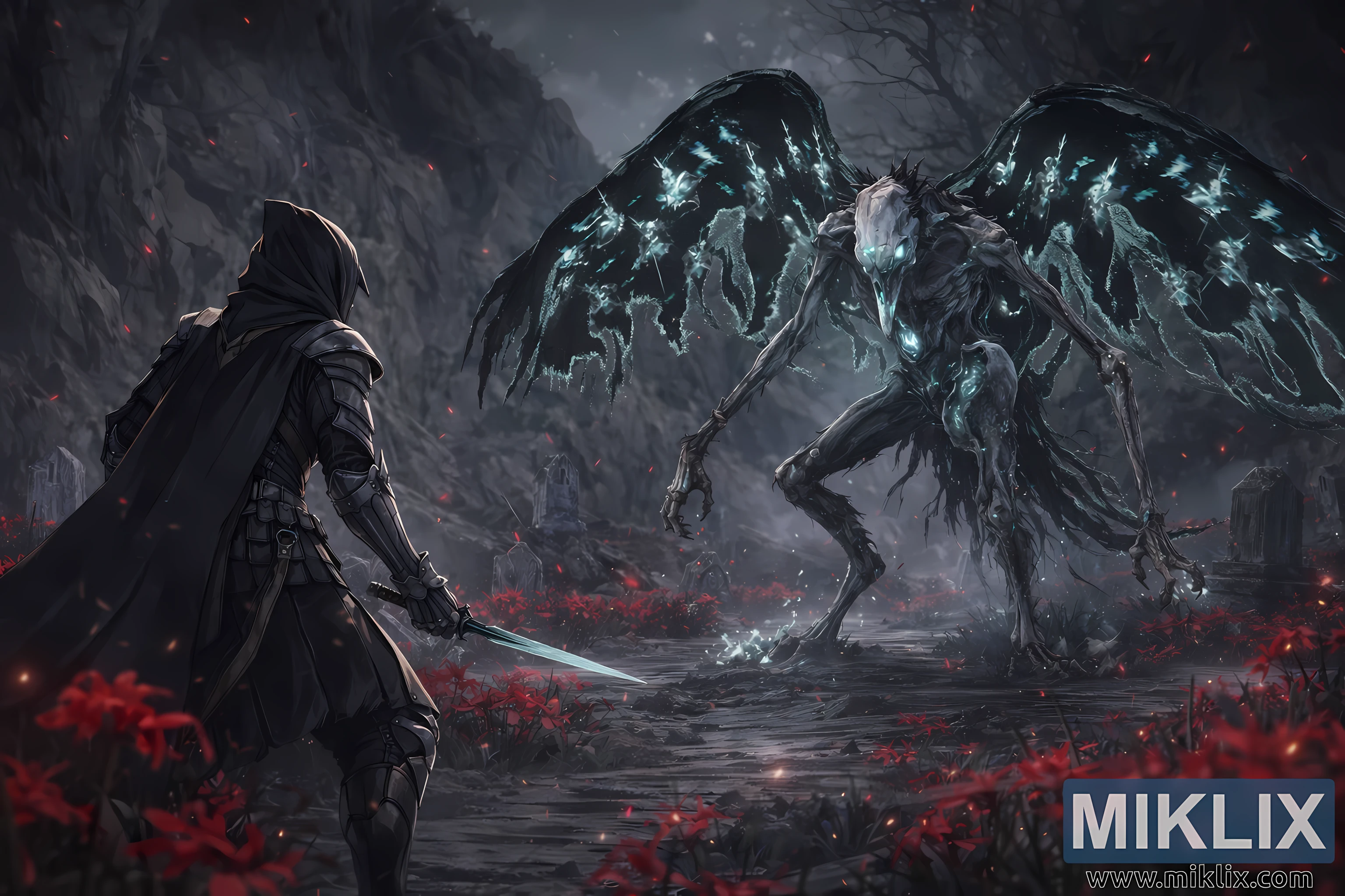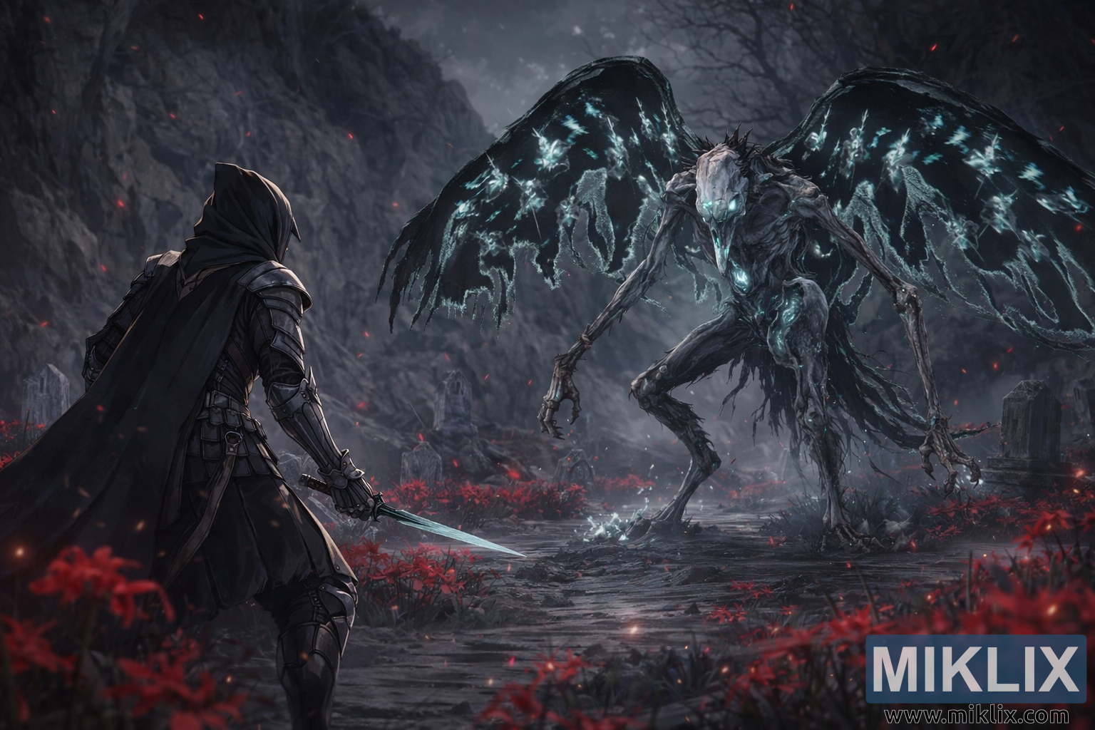 The environment deepens the mood of dread. The battlefield is a flooded grave path, scattered with cracked tombstones and remnants of forgotten ruins. Pools of dark water mirror both figures, subtly blurring their reflections. All around, fields of crimson flowers burn against the otherwise muted palette, their petals drifting through the air like sparks or falling blood. The background cliffs rise steeply, enclosing the scene in a claustrophobic arena of stone and shadow. A grey, storm-heavy sky presses down from above, dusted with drifting ash and red motes of light.