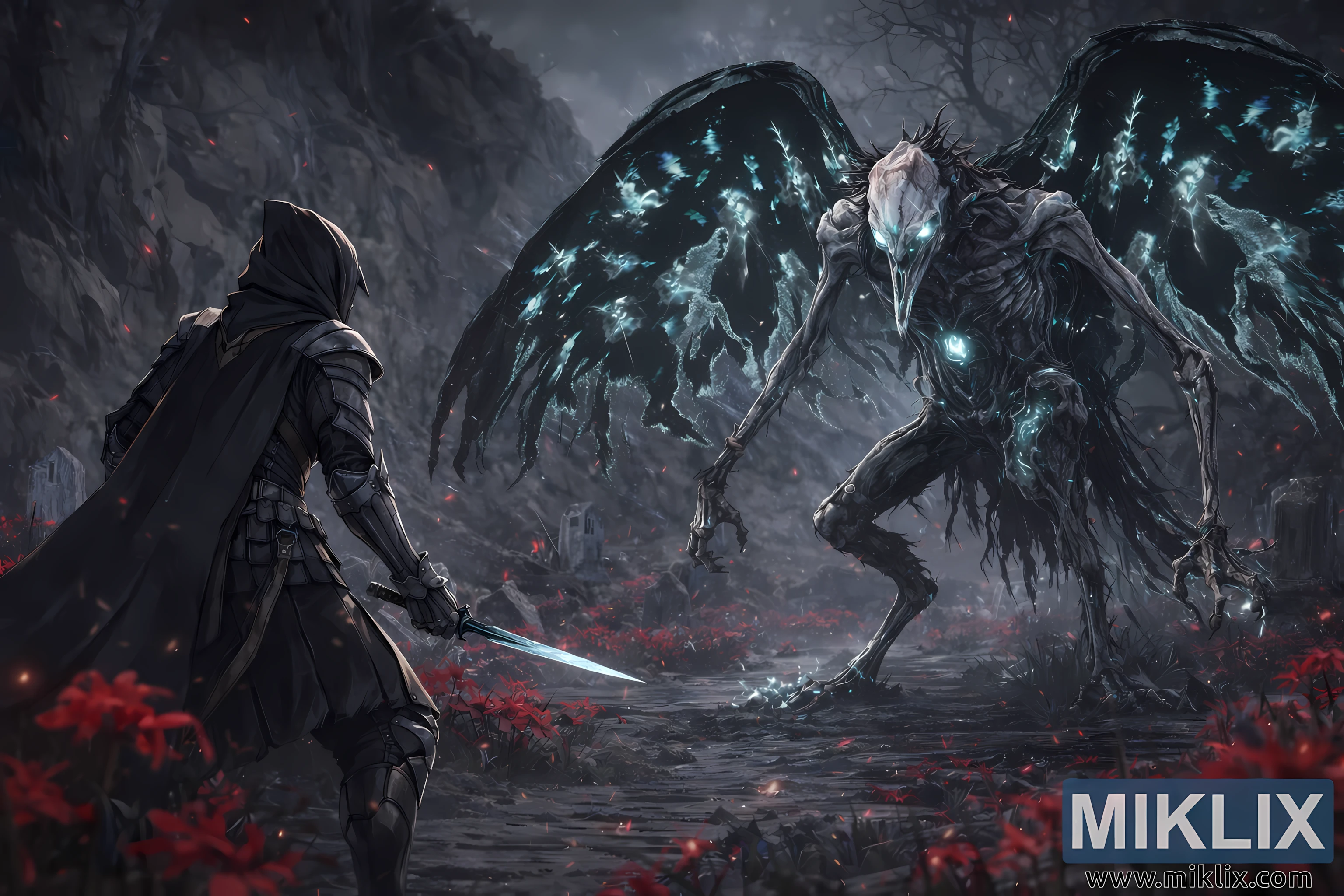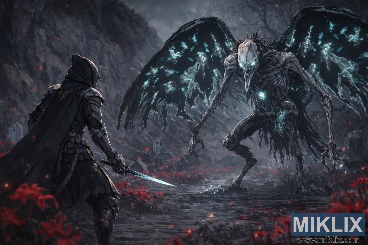 Above, heavy storm clouds roll across the sky, streaked with ash and faint red sparks that echo the scattered petals below. The isometric viewpoint emphasizes the imbalance between hunter and prey: the Tarnished looks fragile against the enormity of the Death Rite Bird and the endless field of graves surrounding them. The moment is utterly still, a suspended breath before chaos — a silent tableau of despair and determination set within a land that has long since forgotten mercy.
