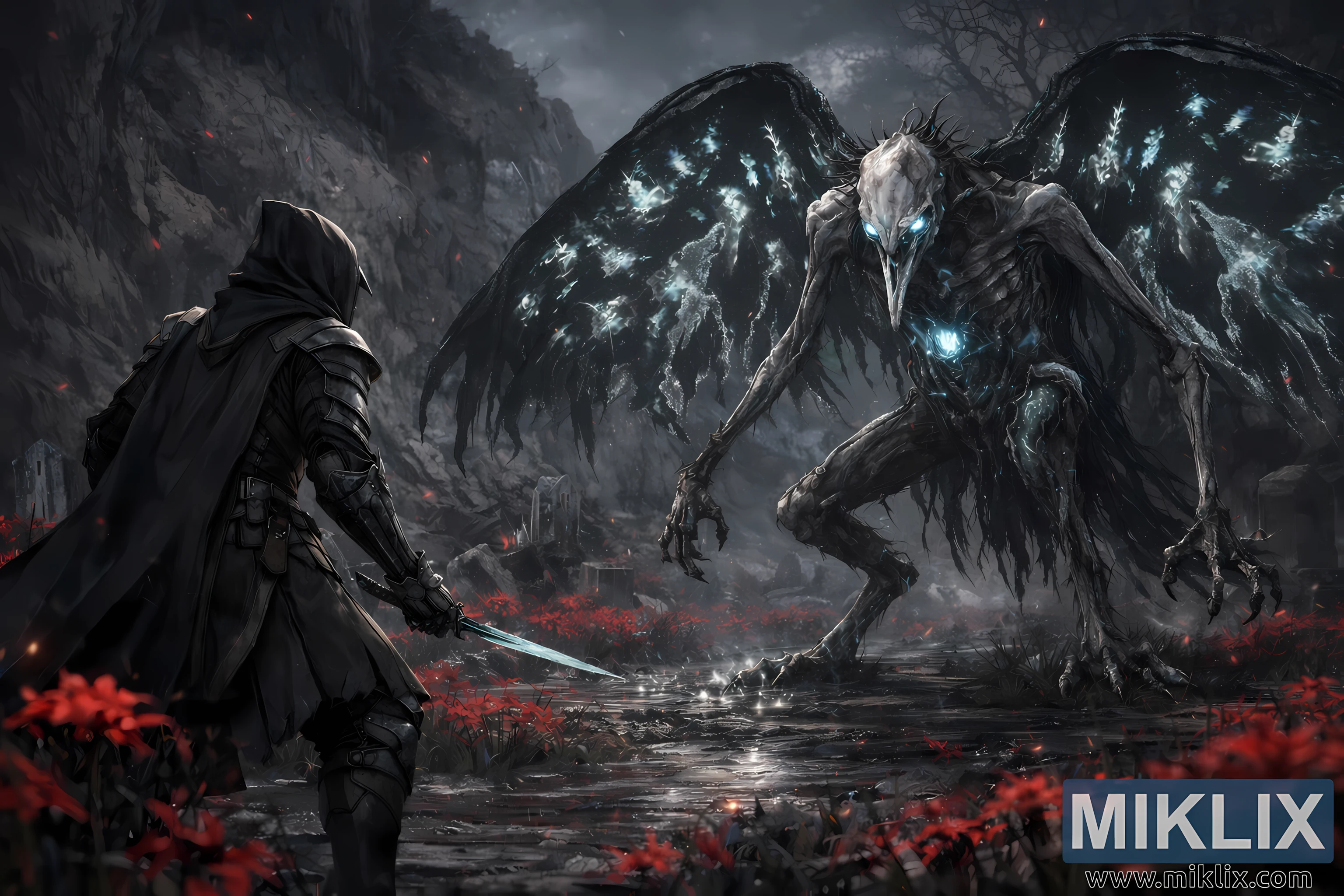 The battlefield itself is a drowned grave path, where shallow water pools around shattered tombstones and broken relics of forgotten heroes. Crimson flowers blanket the ground, their vivid red petals floating through the scene like burning embers, contrasting violently with the grey-blue mist that coils around both combatants. Jagged cliffs rise in the background, closing in on the clearing and heightening the feeling of isolation and inevitability. Overhead, a heavy storm sky looms, flecked with drifting ash and faint sparks of red light.