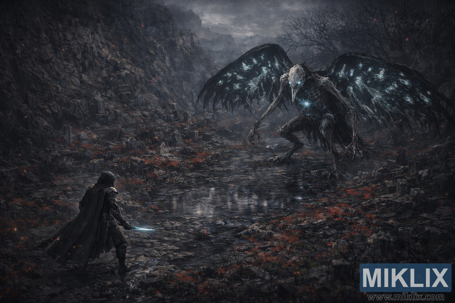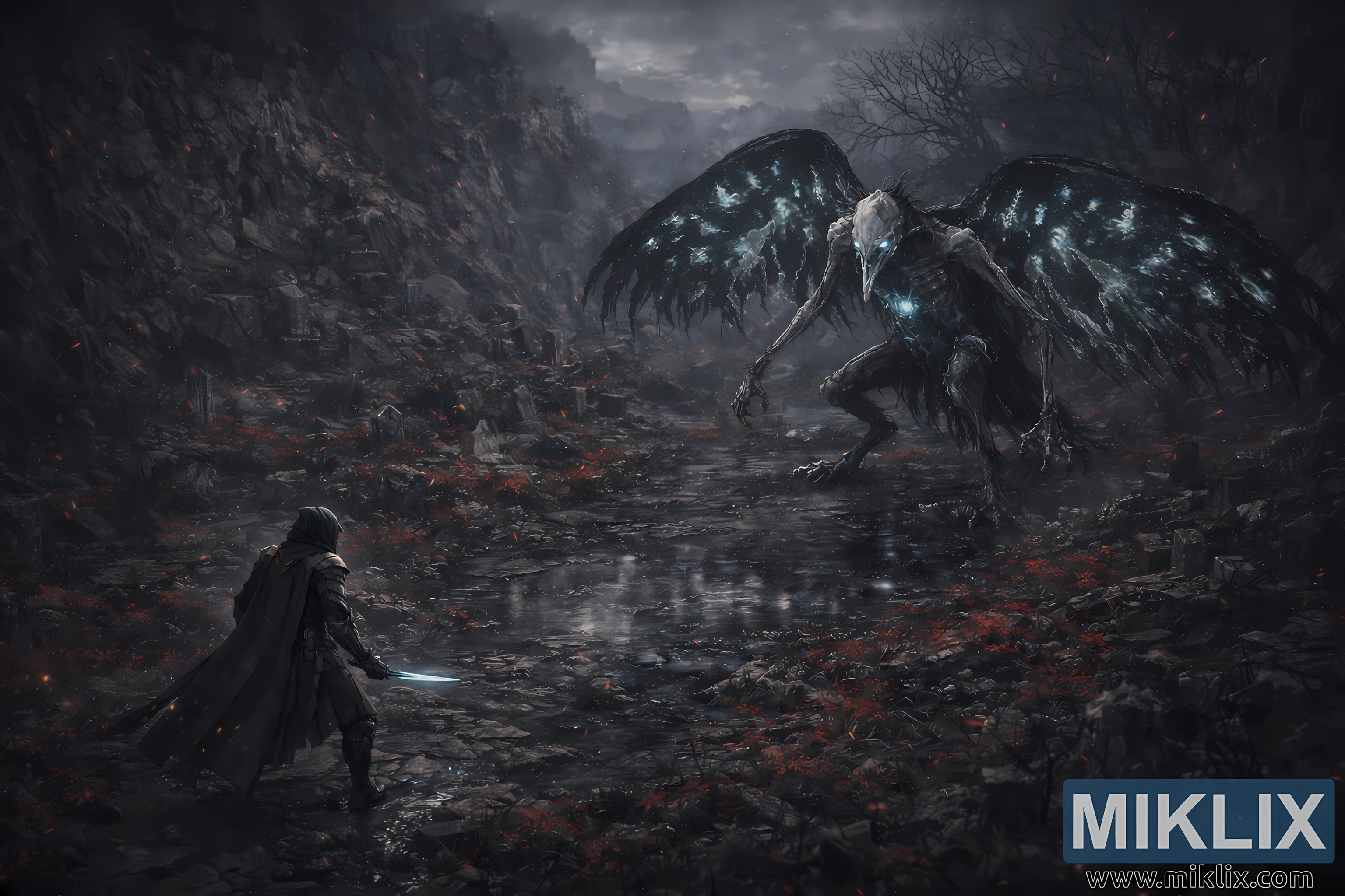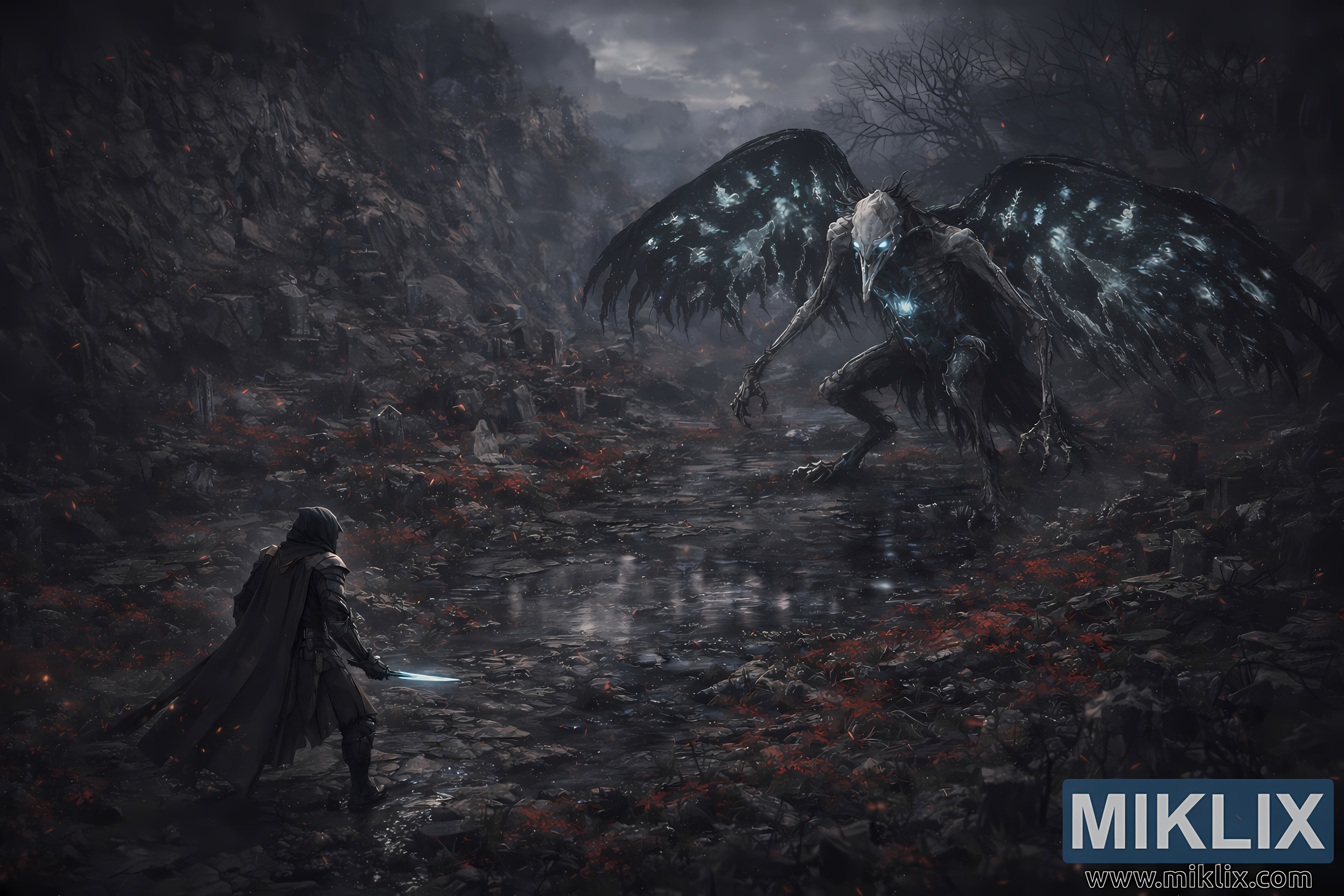Above it all, the sky churns with heavy grey clouds streaked with ash and faint red sparks, as though the land itself is slowly burning from within. The wider framing emphasizes isolation and inevitability: there is no escape route, only a narrow corridor of water and stone between warrior and monster. Everything feels cold, heavy, and decayed, capturing a moment of absolute stillness — the final breath before steel meets bone and the silence of the grave is shattered.