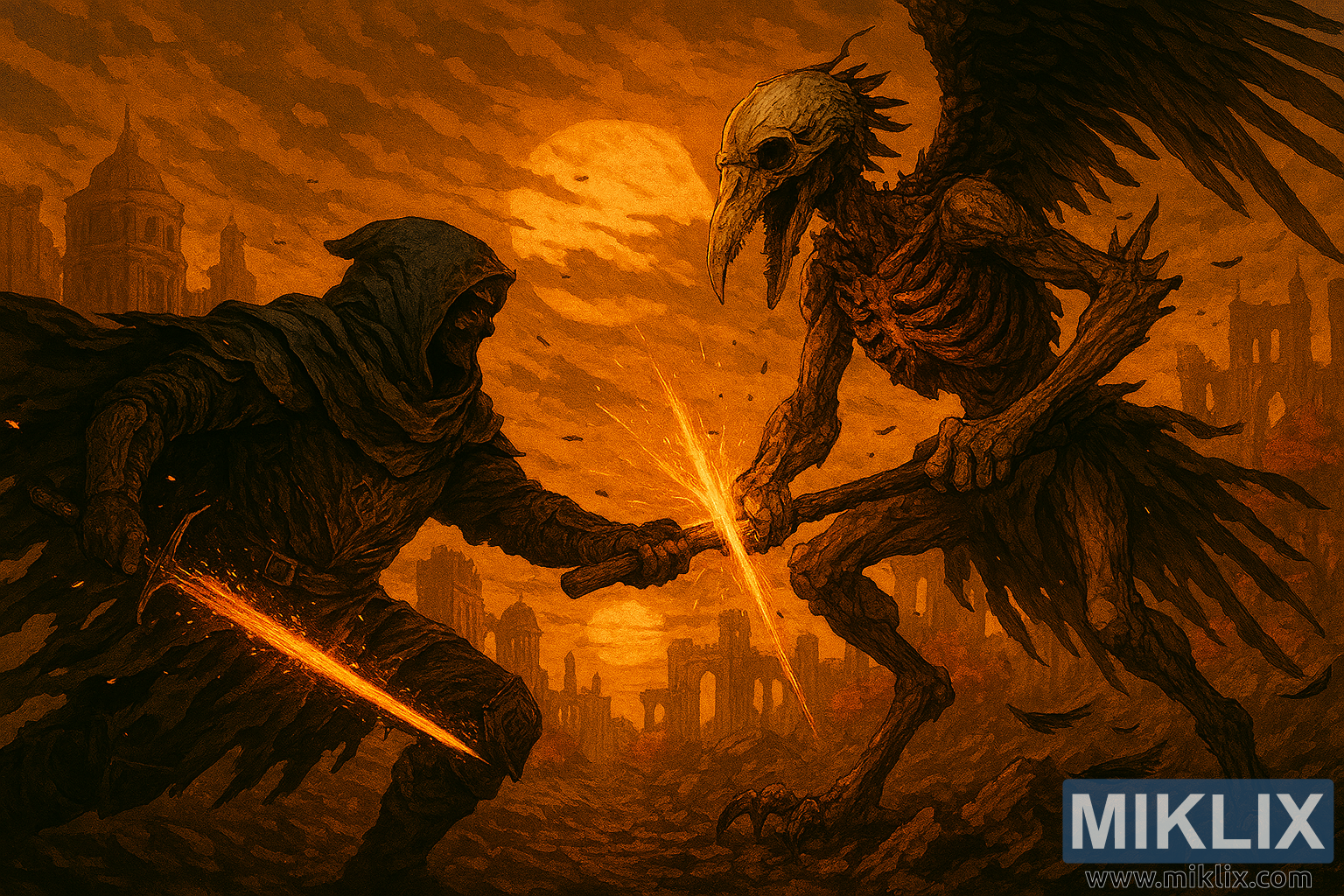 The image’s dynamic motion is emphasized by diagonal lines — the Tarnished’s leap, the Deathbird’s wing sweep, and the converging weapons — all drawing the viewer’s eye to the center of the clash. The color palette blends warm golds and oranges with deep blacks and grays, enhancing the tension and drama. Every detail, from the embroidery on the Tarnished’s bracers to the sinewy decay of the Deathbird’s limbs, contributes to the realism and intensity of the encounter.