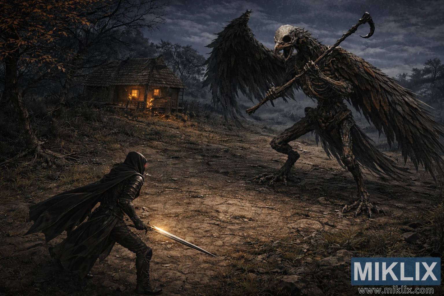 The environment plays a crucial narrative role. A small wooden shack sits in the mid-background, its windows glowing with warm amber light that spills onto the surrounding grass and dirt, forming a fragile island of comfort within the gloom. The terrain is uneven and littered with stones, patches of dry grass, and faint pathways that become more visible from the elevated viewpoint. Sparse, leafless trees line the horizon, their twisted silhouettes echoing the skeletal forms of the monster’s wings. Above, drifting storm clouds partially obscure faint stars, creating a brooding yet expansive sky. The interplay of cool moonlight and localized warm illumination establishes depth, contrast, and emotional tension. Overall, the image conveys a quiet yet powerful moment before violence—an uneasy calm where scale, lighting, and perspective combine to immerse the viewer in a haunting fantasy world poised on the brink of battle.