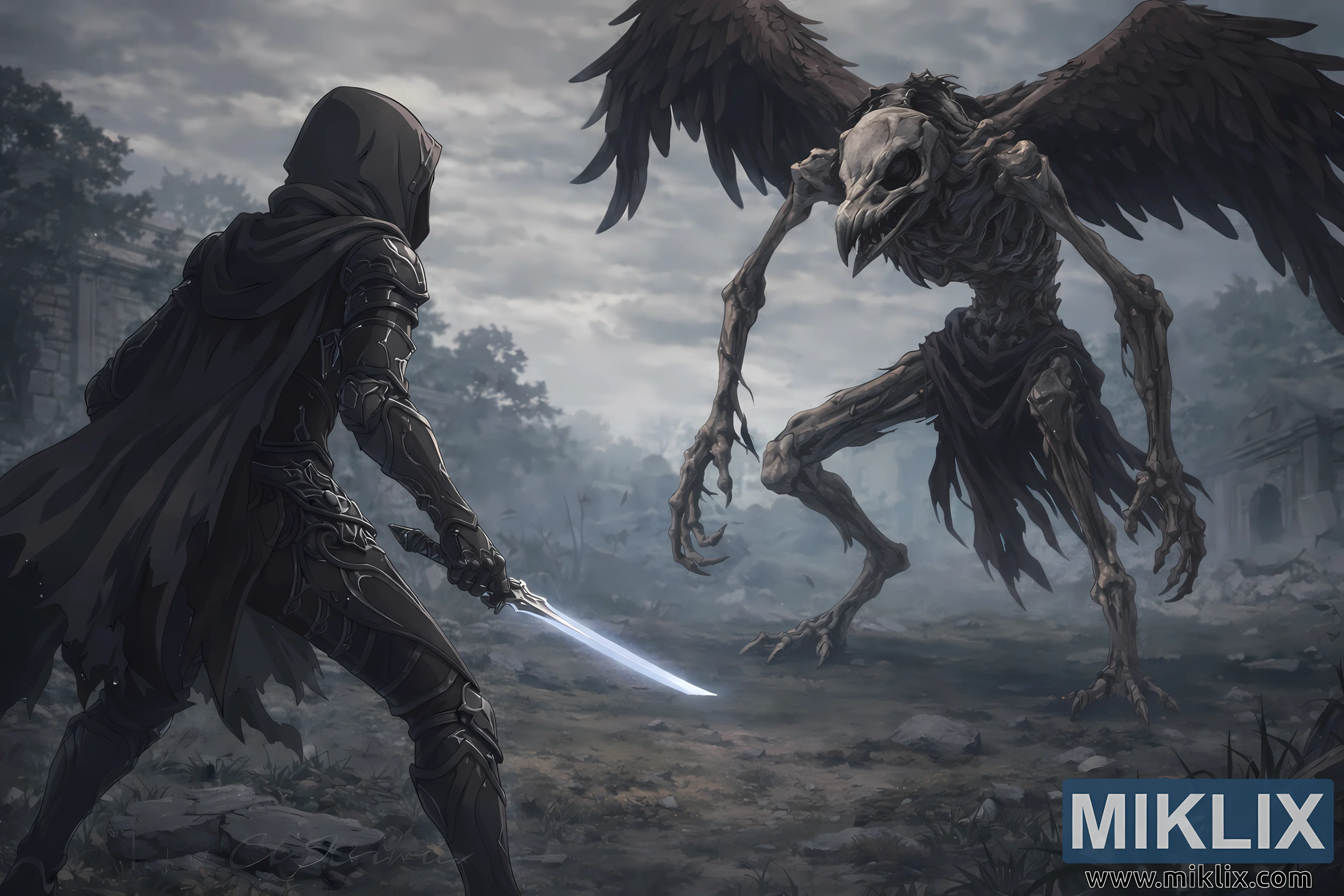 Anime-inspired Elden Ring fan art showing the Tarnished in Black Knife armor warily approaching the Deathbird boss in the misty Weeping Peninsula moments before battle.
