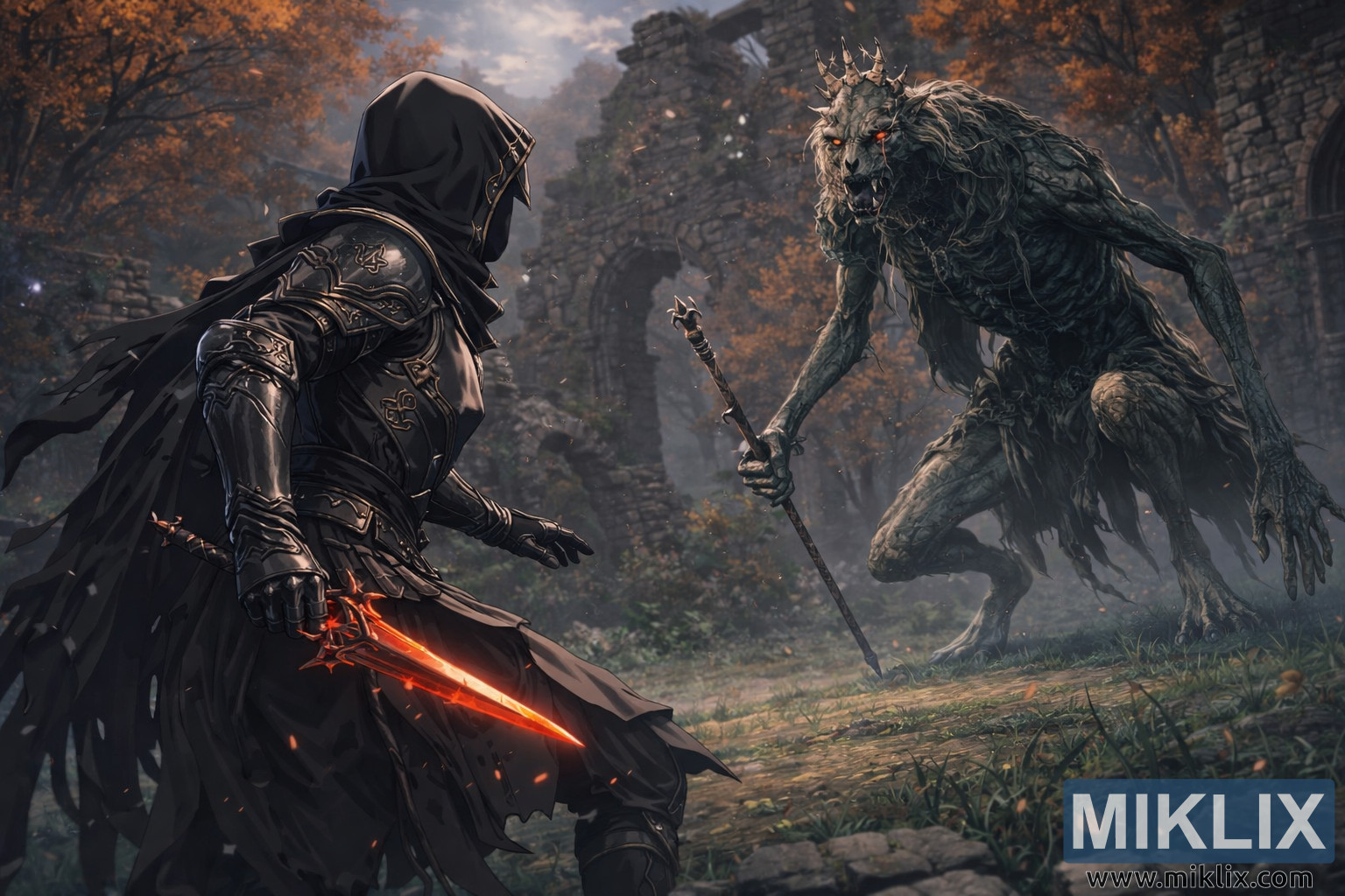 Image: Tarnished Confronts the Demi-Human Queen in Forest Ruins