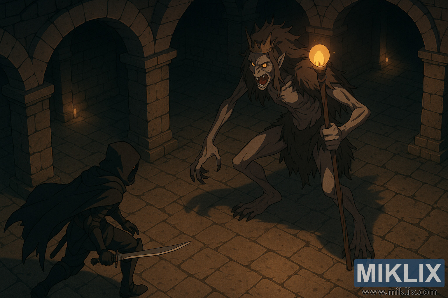 Opposite the Tarnished, occupying the right side of the composition, looms Demi-Human Queen Gilika. From the isometric angle, her height and unnatural proportions are especially striking. She is tall and skeletal, with elongated limbs and a narrow torso that give her a stretched, almost insect-like silhouette. Her grayish skin clings tightly to bone, while sparse, ragged fur hangs from her shoulders and waist. Gilika’s posture is hunched yet dominant, one long arm extended with clawed fingers splayed, as if reaching or preparing to lash out.