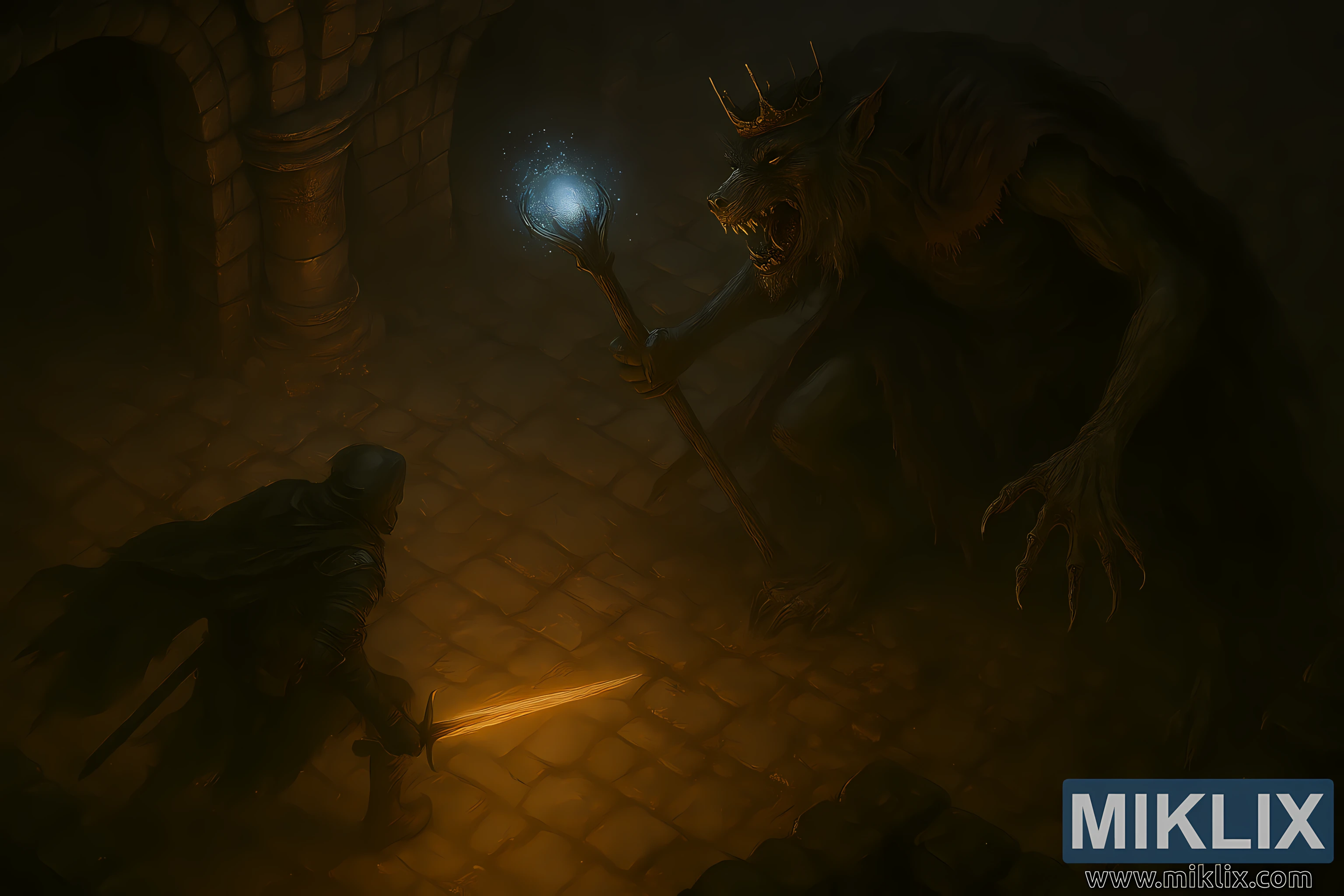 The environment is richly detailed: the cellar’s stone walls are built from aged, moss-covered bricks, and the floor is composed of uneven cobblestones, cracked and worn by centuries of decay. Arched supports rise from the corners, framing the duel and leading the viewer’s eye toward the center. Dust and debris scatter across the floor, and the interplay of warm and cool lighting creates a chiaroscuro effect that heightens the drama.