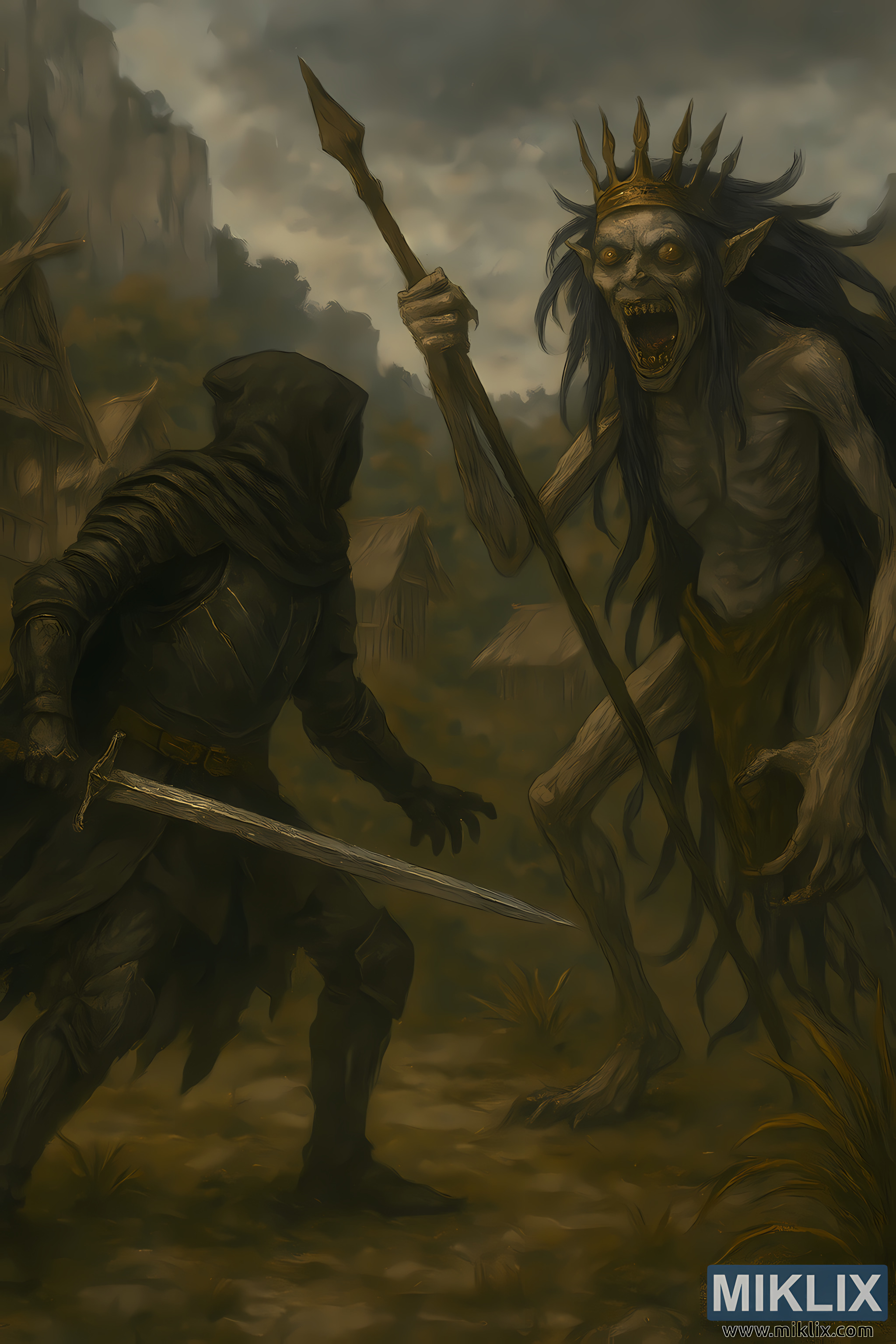 The brushwork is loose and atmospheric in the background, while the characters are rendered with meticulous detail. Textures such as the rough wood of the huts, the coarse fabric of Maggie’s garment, and the tarnished metal of the armor and crown are richly depicted. The image evokes the grim beauty and perilous mood of Elden Ring’s world, blending realism with dark fantasy in a haunting visual narrative.