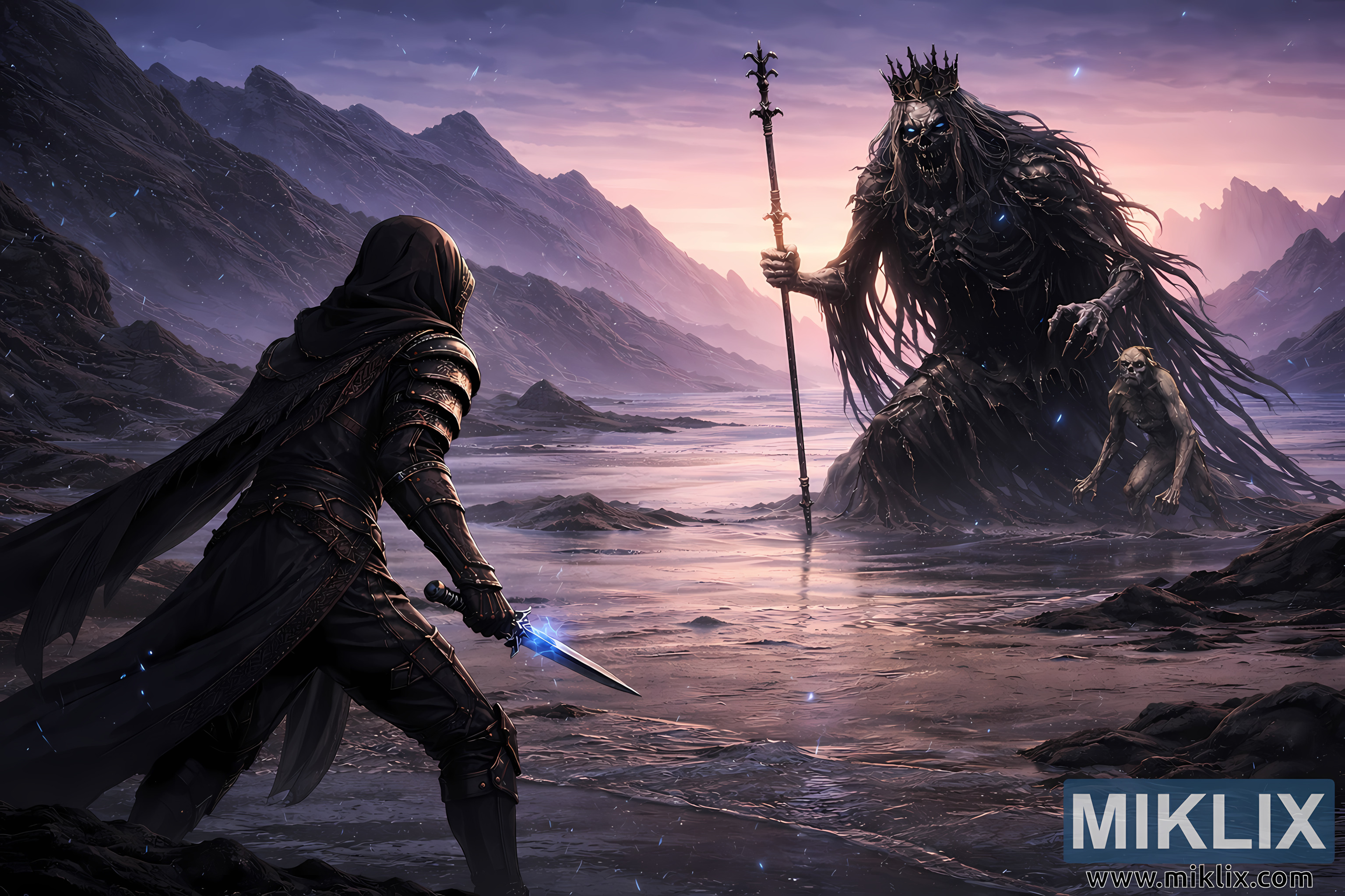 Across the shallow shoreline to the right looms the Demi-Queen Marigga, immense in scale and dominating the scene. Her skeletal, elongated form rises from the reflective water, dwarfing the Tarnished and reinforcing the imbalance of power. Tattered, dark robes cling to her frame like drowned fabric, flowing outward and downward as though animated by both wind and lingering magic. A jagged crown sits atop her skull-like head, marking her as a fallen monarch. Her eyes glow with an eerie blue light that mirrors the Tarnished’s blade and the scattered motes drifting through the air, visually tying both figures to the same cursed energy. She grips a tall, ornate staff planted firmly into the wet sand, anchoring her presence, while her free hand extends slightly forward, fingers curled in quiet menace rather than open aggression.