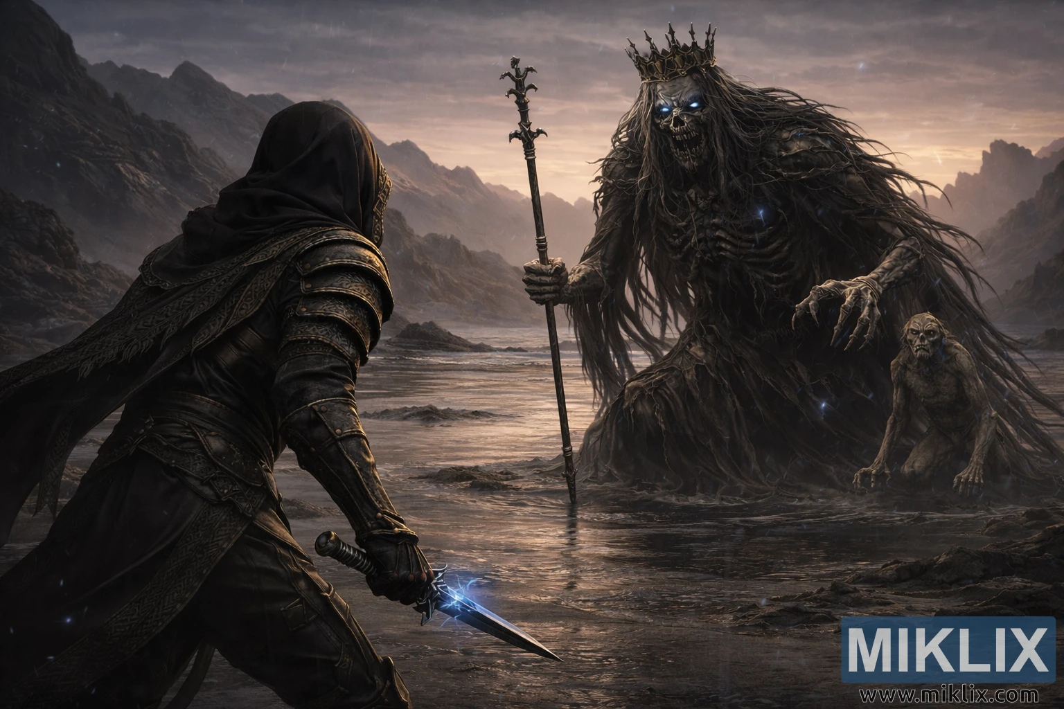 Opposite the Tarnished and now standing very close is the Demi-Queen Marigga, whose presence feels oppressive and immediate. Her towering, skeletal form rises from the shallow shoreline, water lapping around her lower body. The realism of her design emphasizes decay and age: exposed bone structure, stretched, desiccated flesh, and long, stringy hair clinging together from moisture. Her tattered robes hang heavily, soaked and dark, moving sluggishly rather than dramatically. A jagged, corroded crown rests atop her skull, its uneven points reinforcing her fallen royalty. Her eyes glow with a dim, unnatural blue light that feels internal and ominous rather than decorative. She grips an ornate staff firmly, its base pressed into the wet ground between her and the Tarnished, while her free hand hangs forward slightly, fingers bent and claw-like, suggesting latent violence held in check.