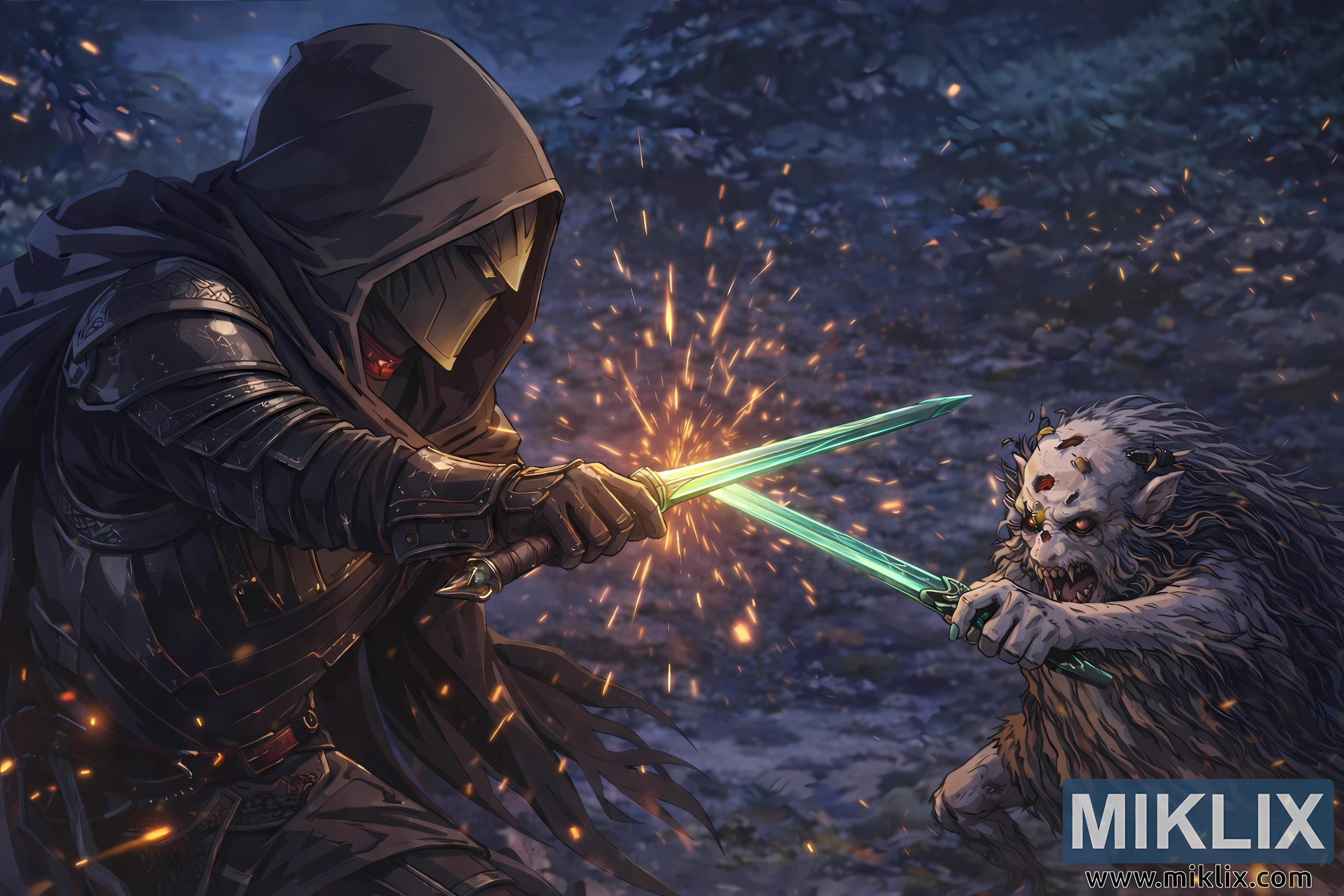 At the center of the composition, the two weapons collide, frozen in the split second of impact. A shower of golden sparks erupts from the meeting point of steel, spraying outward in curved arcs that illuminate both fighters. The sparks form a radiant focal point, drawing the viewer’s eye and reinforcing the violence and immediacy of the clash. Subtle motion blur in the embers and cloth edges suggests that this is not a posed moment but a heartbeat captured in the middle of a deadly exchange.