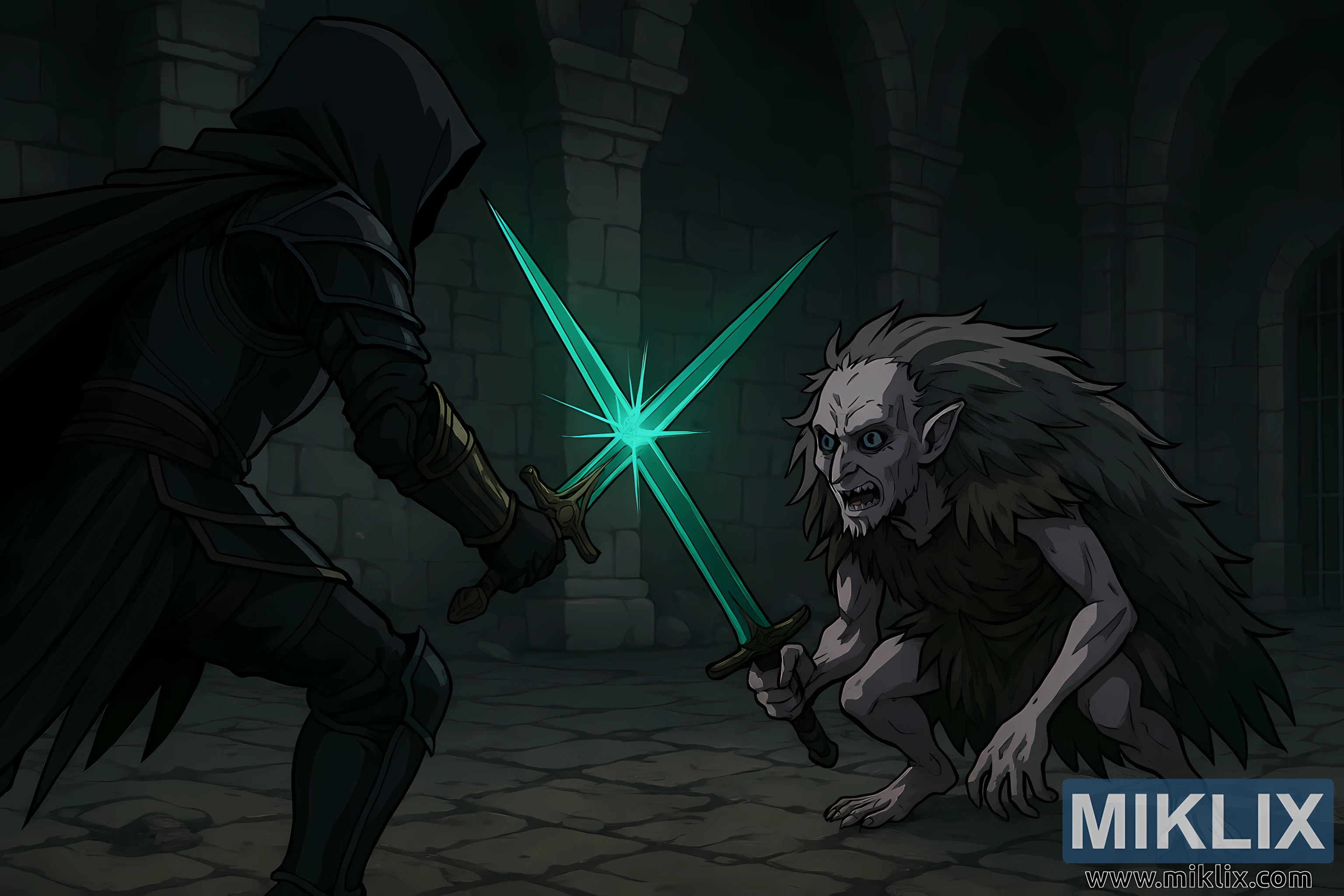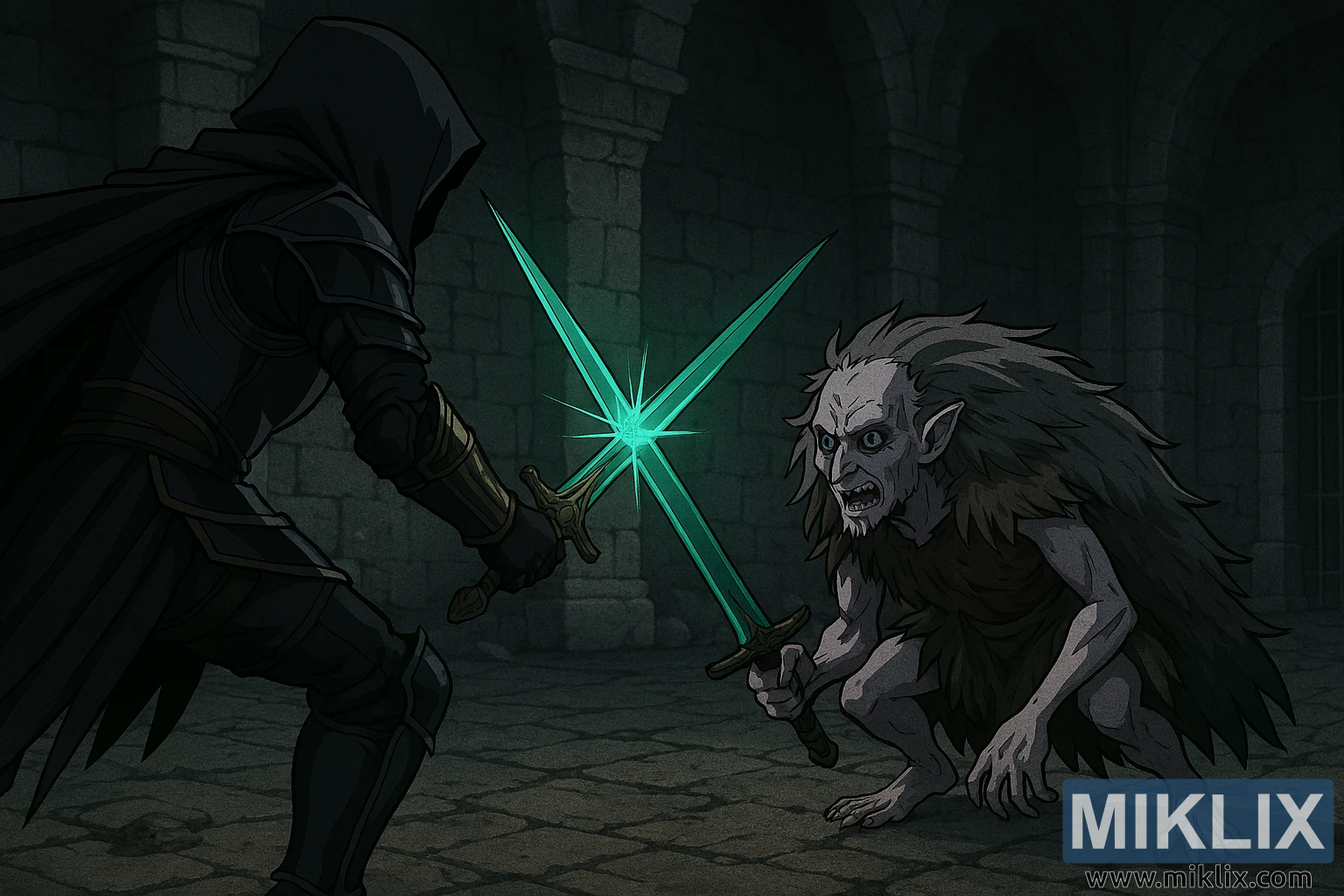 The swords meet at the center of the composition, emitting magical sparks and green energy that reflect off the surrounding surfaces. The lighting is moody and atmospheric, with cool grays and deep shadows contrasting against the vibrant glow of the weapons. The characters are framed dynamically, their poses exaggerated in classic anime style, emphasizing motion and emotion.
