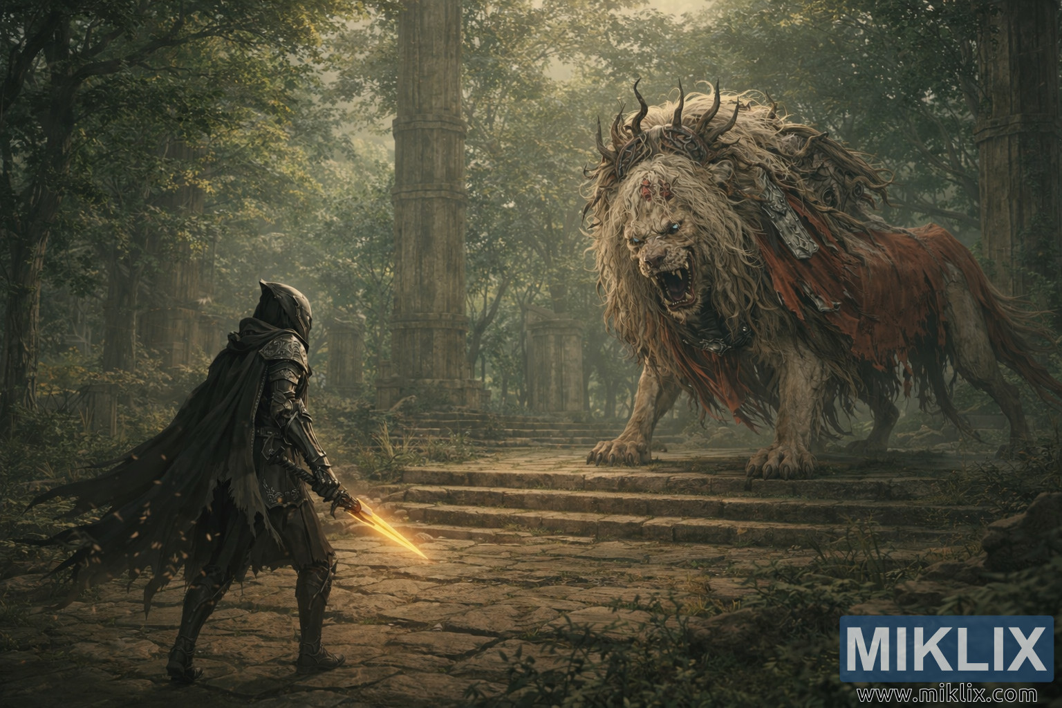 The environment stretches outward behind them, revealing tall, weathered stone columns scattered throughout the clearing. These pillars, partially collapsed and overtaken by moss, vines, and creeping roots, hint at a long-forgotten civilization swallowed by time and nature. Dense trees form a canopy overhead, their leaves filtering soft, diffused sunlight that creates shafts of light and drifting haze throughout the scene. Broken stone tiles, fallen leaves, and patches of grass cover the ground, blending ruin and wilderness into a single, haunting battlefield.