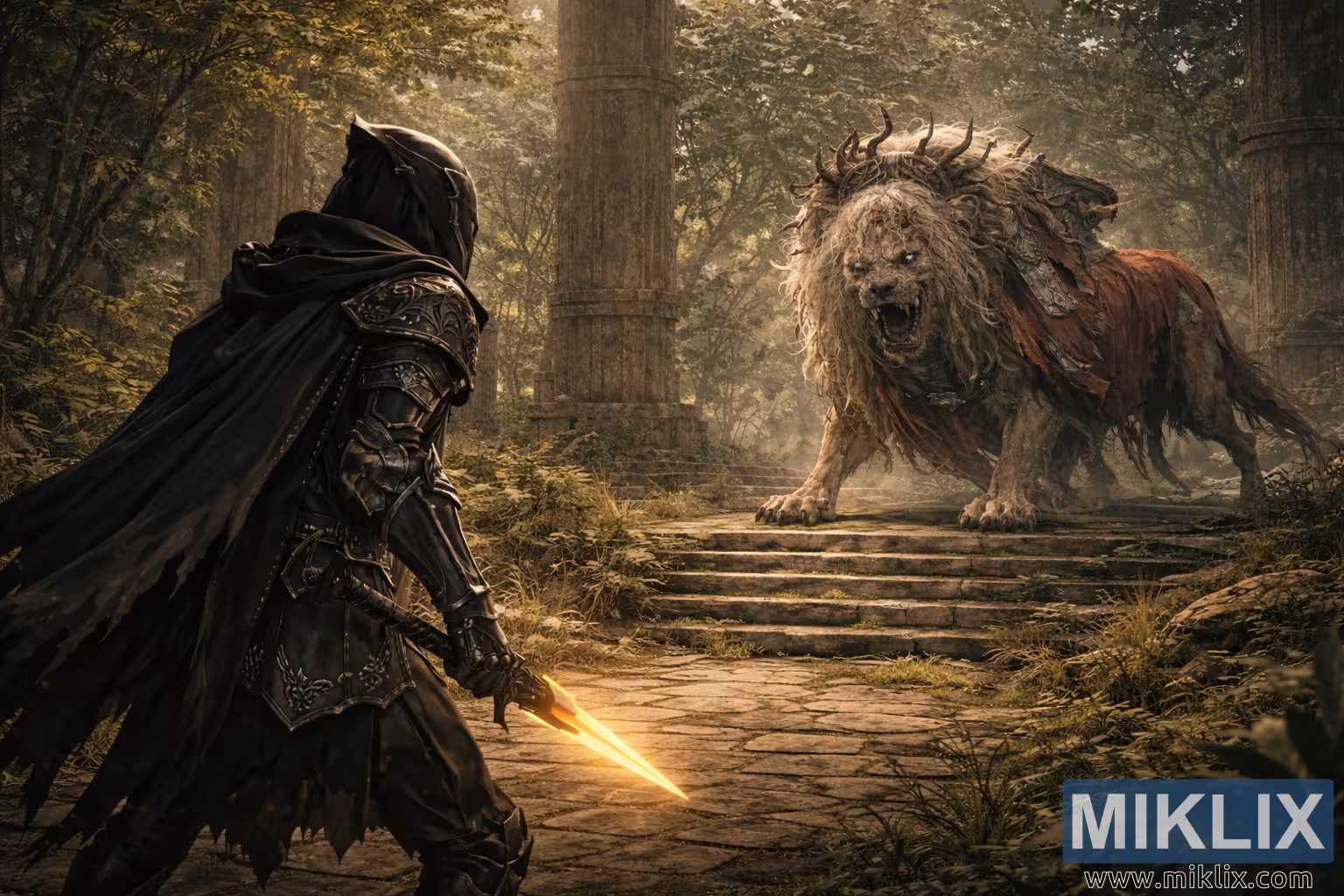 In the Tarnished’s right hand, a glowing golden dagger is held low and ready. Its warm, radiant light contrasts sharply with the subdued, earthy tones of the surrounding ruins and forest, drawing the eye along the line of sight toward the looming enemy. The Tarnished’s head is turned fully toward the Divine Beast Dancing Lion, their attention unwavering, conveying calm focus rather than fear.