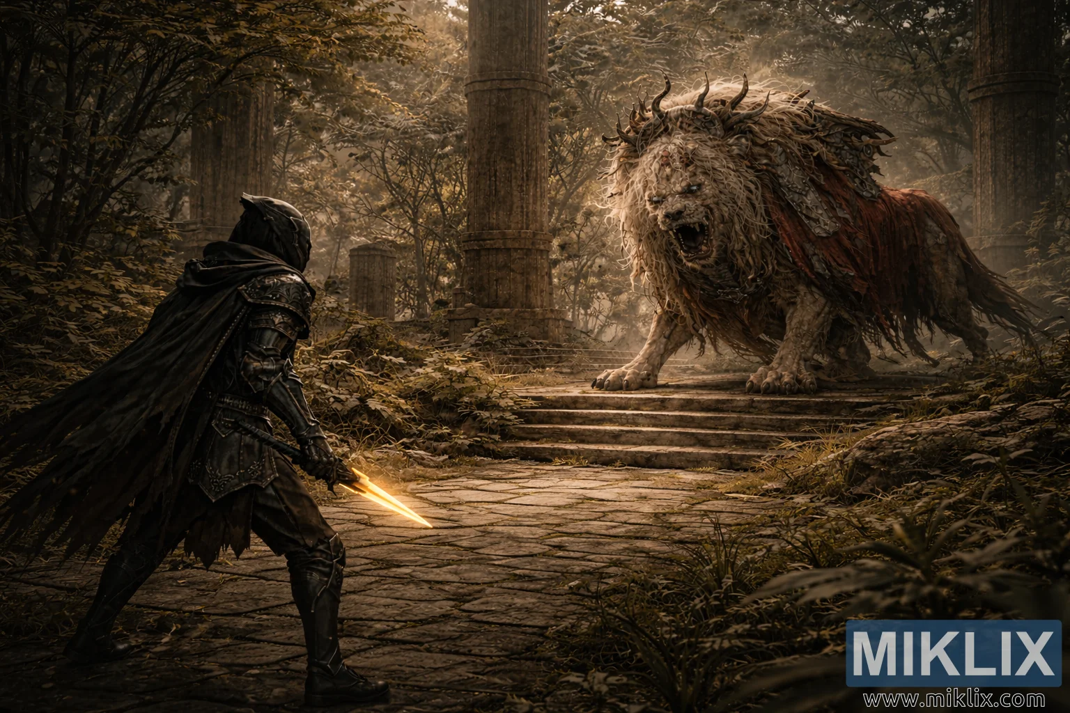 The environment stretches outward behind and around them. Tall, weathered stone columns rise among dense trees, their surfaces cracked and overtaken by moss, vines, and creeping roots. Some columns lean or stand broken, reinforcing the sense of long-abandoned grandeur. Sunlight filters through the forest canopy in soft, diffused beams, illuminating drifting dust and mist that hang in the air. The ground is layered with fallen leaves, grass, and fragmented masonry, blending nature and ruin into a somber, decaying battlefield.