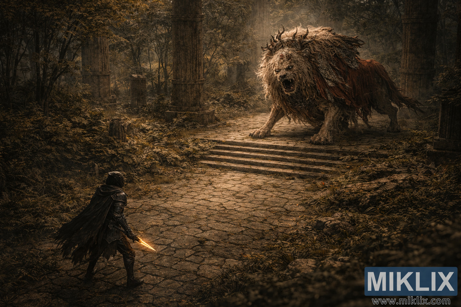 The environment unfolds expansively around them. A wide stone path, cracked and uneven, leads from the Tarnished toward the steps and the beast, guiding the viewer’s eye through the composition. Tall, weathered stone columns rise in the background, some intact and others broken or leaning, their surfaces overtaken by moss, vines, and creeping roots. Dense trees surround the ruins, their leaves forming a canopy that filters dim, diffuse light onto the scene. Mist and dust drift through the air, softening edges and enhancing the ancient, abandoned atmosphere.
