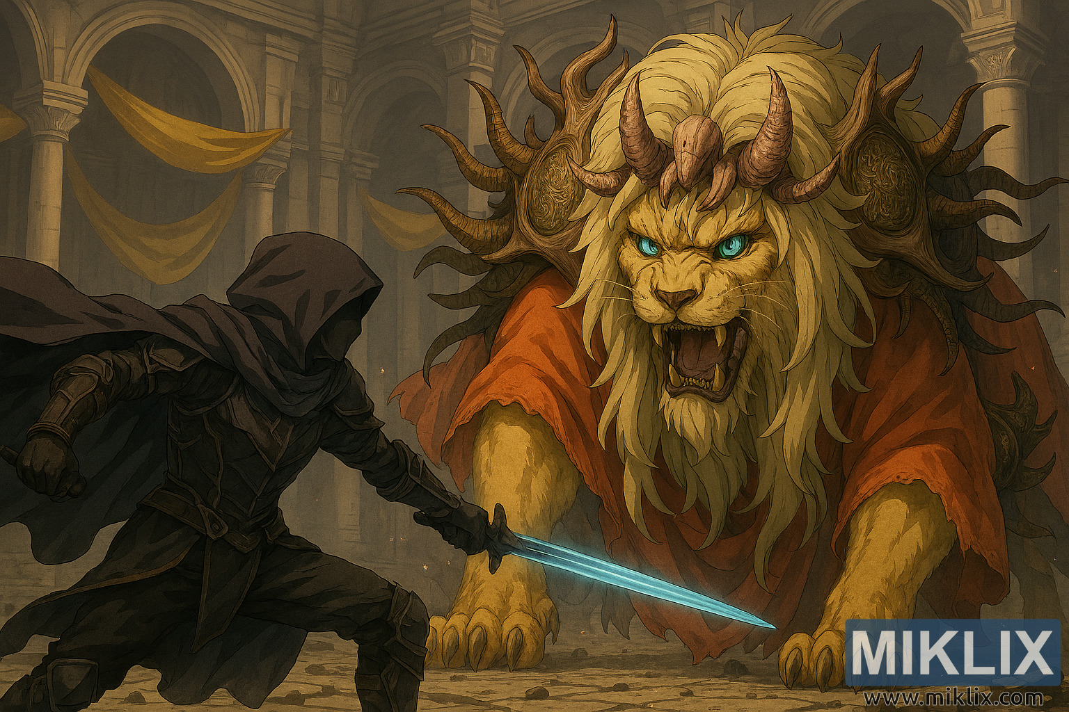 Epic anime-style Elden Ring fan art of the Tarnished battling Divine Beast Dancing Lion in a grand hall