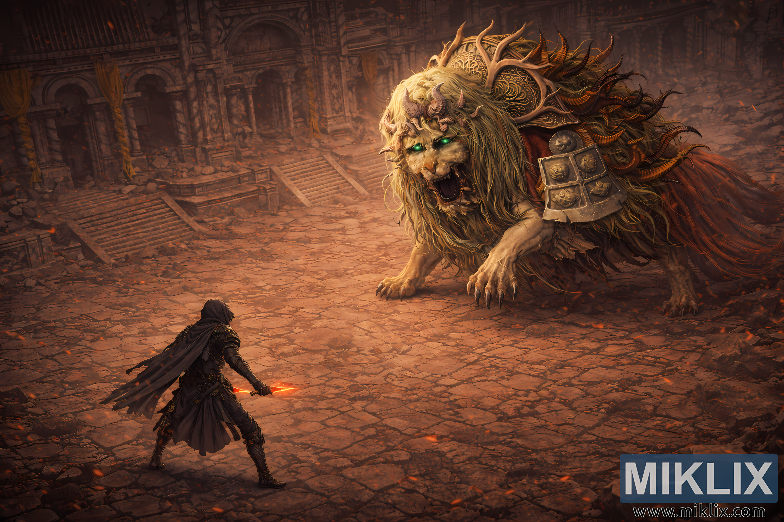 The environment heightens the drama. Torn golden drapes hang from balconies and archways, and drifting embers float through the smoky air, catching the light from the Tarnished’s blades and reflecting in the lion’s eyes. The warm orange glow of sparks contrasts with the cold gray-brown masonry of the ruins, creating a vivid interplay of heat and decay.