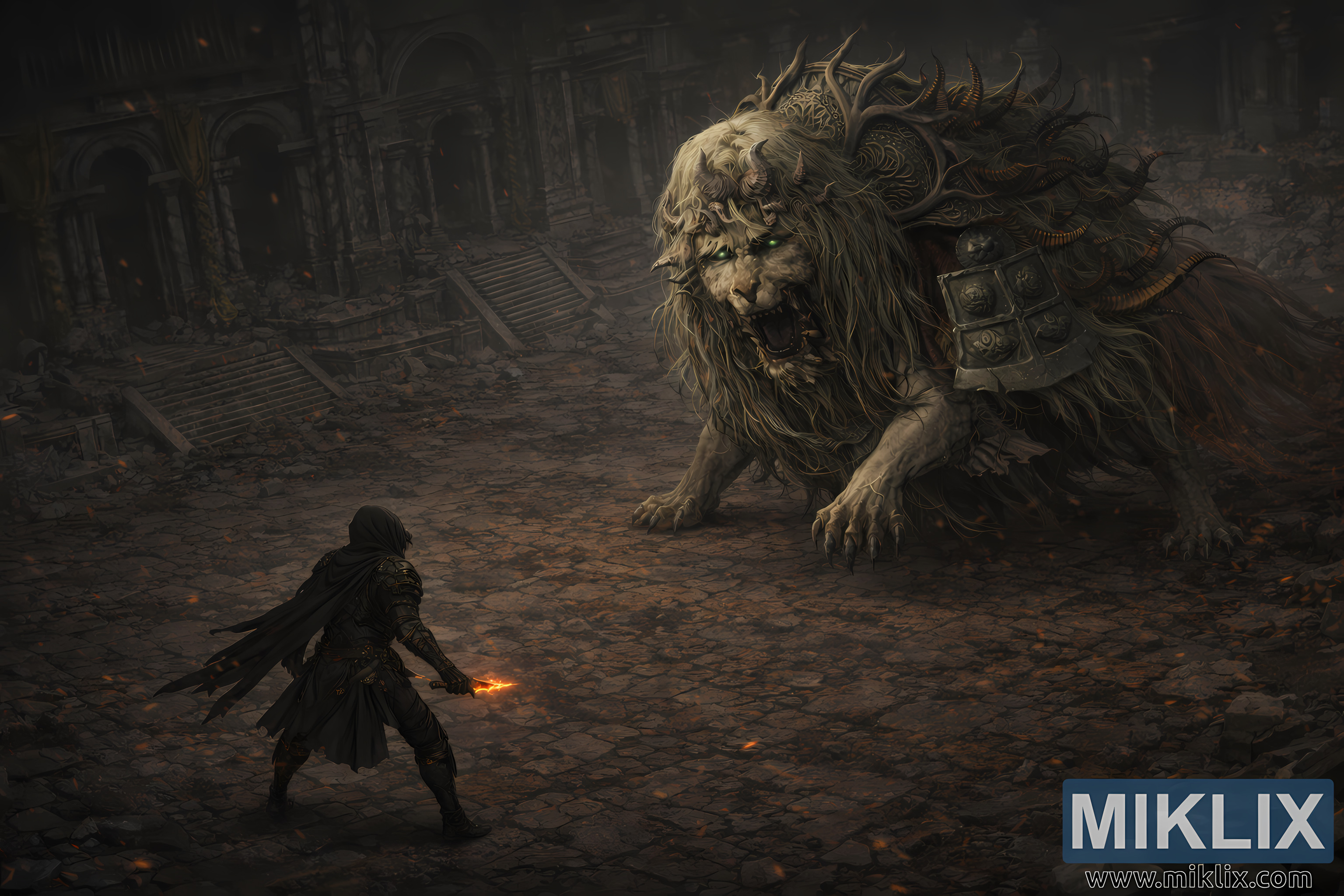 The surrounding architecture reinforces the oppressive atmosphere. Broken staircases ascend to collapsed arches and balconies, their edges softened by dust and shadow. Tattered golden drapes hang limply from high ledges, dulled and stained, hinting at the courtyard’s former grandeur before decay and ruin claimed it. Smoke hangs in the air, blurring the background into a murky haze and muting the color palette into grays, browns, and soiled golds.