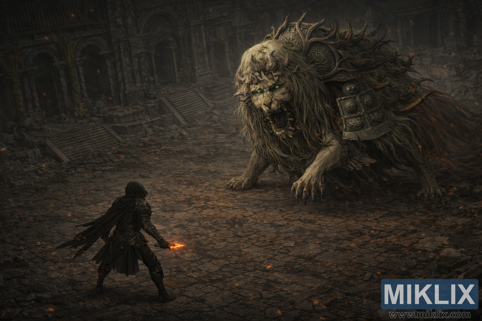 Opposite him, filling the right side of the courtyard, looms the Divine Beast Dancing Lion at an overwhelming scale. The creature’s body is massive and grounded, its tangled pale mane hanging in greasy, matted strands over ceremonial armor plates bolted to its flank. Twisted horns and antler-like growths coil from its skull and shoulders, casting knotted shadows across its fur. Its eyes burn an eerie green, piercing through the dimness as its jaws gape in a snarl, revealing chipped, yellowed teeth. One huge forepaw presses into the courtyard floor, claws biting into cracked tiles as if the stone itself were soft beneath its weight.