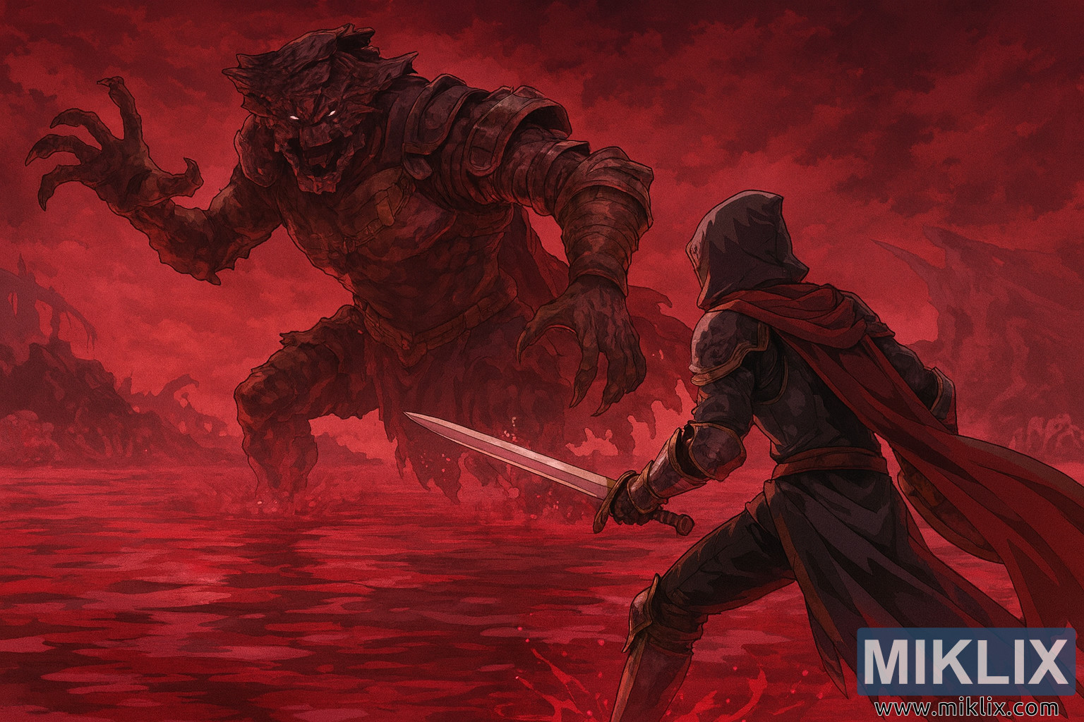 The Lake of Rot itself is rendered with haunting beauty. The ground is submerged in a thick, viscous red liquid that ripples and splashes around the combatants. The sky above is choked with dark crimson clouds and drifting toxic vapors, casting an eerie glow over the scene. In the distance, skeletal remains of ancient beasts lie half-submerged, adding to the desolation and danger of the setting. Jagged rock formations and decaying ruins frame the battlefield, their silhouettes barely visible through the haze.