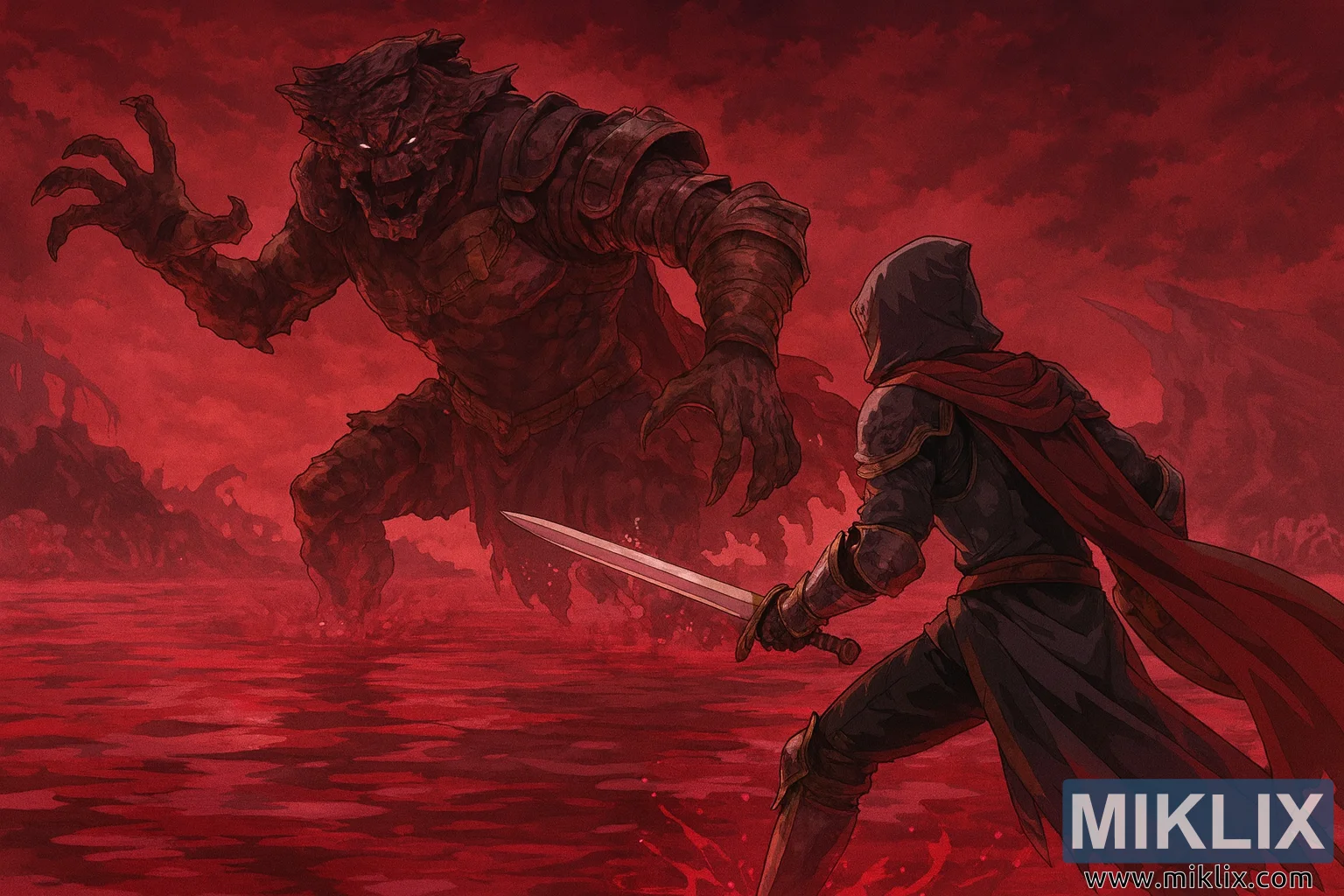 Epic anime-style Elden Ring fan art featuring the Tarnished in Black Knife armor fighting the Dragonkin Soldier in the crimson Lake of Rot.