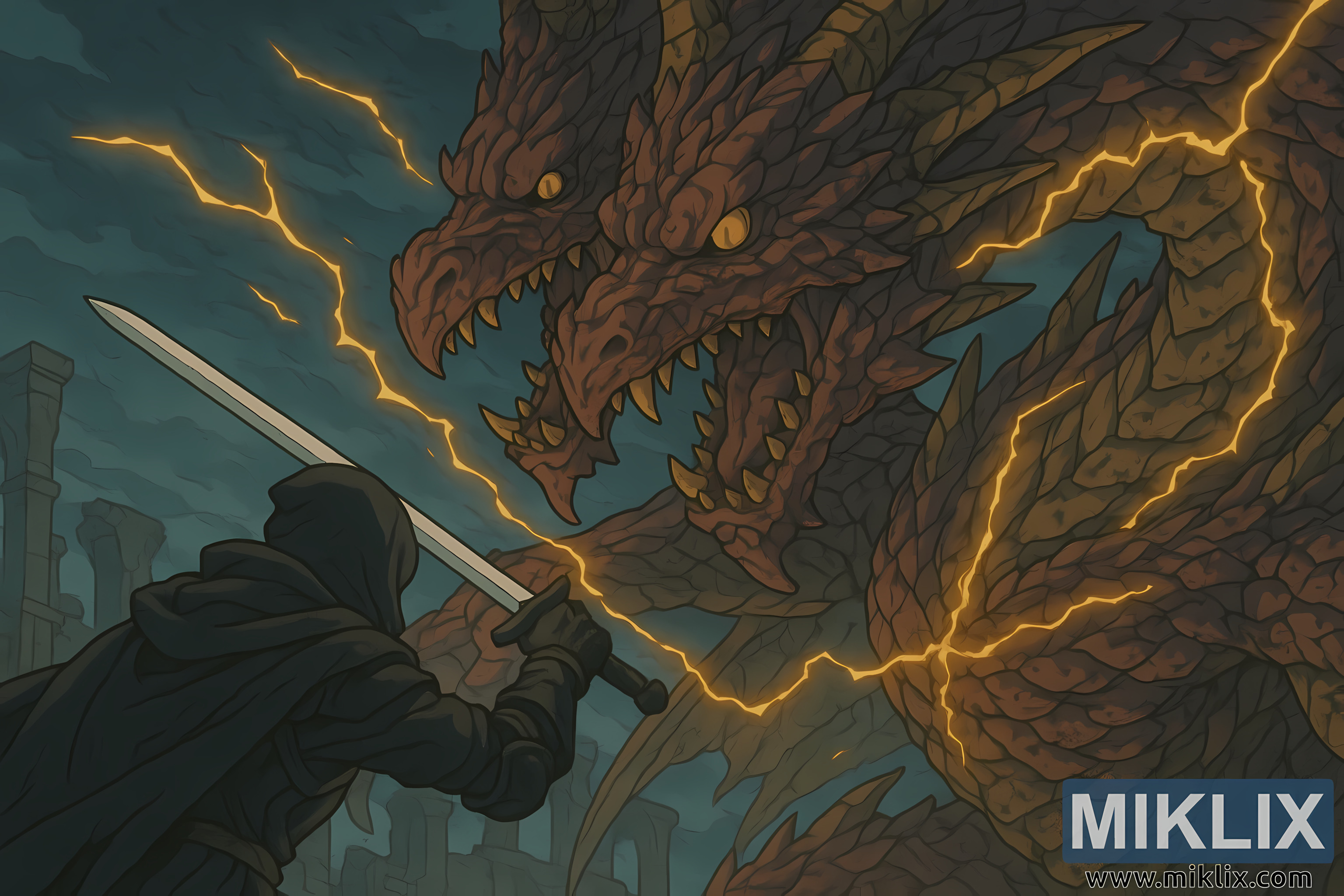 Directly opposing them looms Dragonlord Placidusax, a colossal, two-headed dragon of apocalyptic grandeur. Each head lunges forward in fury, mouths agape, releasing torrents of lightning-charged energy that crackle through the air. The creature’s scales shimmer with molten gold and obsidian hues, and veins of luminous energy pulse beneath its skin like living thunder. The dragon’s wings, partially unfurled, dominate the upper frame, their sheer span framing the composition and amplifying the sense of scale. Jagged bolts of lightning connect its claws to the ruined ground, fusing the beast with the storm that rages around it.