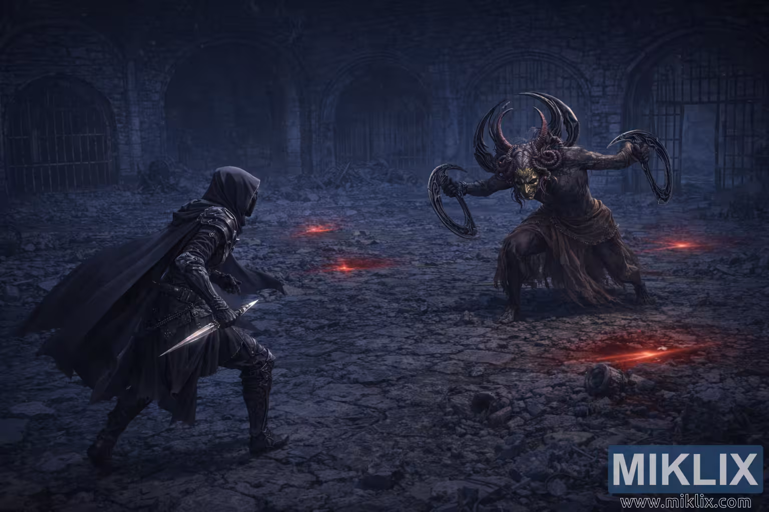 Opposite, on the right, looms Curseblade Labirith, its inhuman form towering over the scattered debris. Its skin is a sickly charcoal hue, stretched tight across wiry muscle. From its head sprout twisted horn-like structures that arc outward like bladed antlers, framing a grotesque golden mask fused to its face. Dark, fleshy tendrils coil around its skull and neck, adding to the creature’s nightmarish silhouette. Each of its arms grips a crescent-shaped ring blade, their serrated edges catching the faint red glimmer that bleeds from glowing marks in the stone.