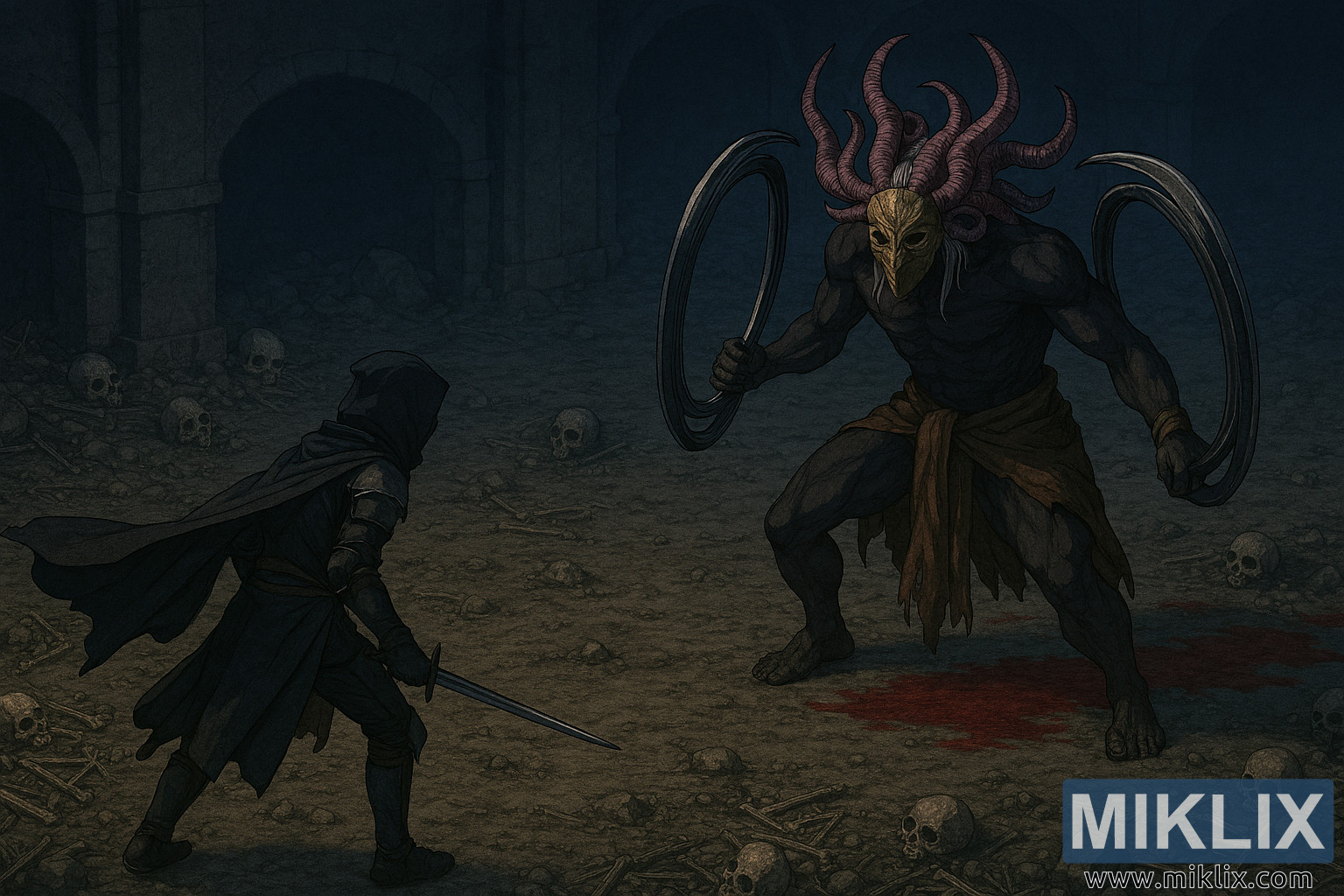 Opposite, Curseblade Labirith towers with grotesque majesty. Its muscular, dark-skinned body is draped in a tattered brown loincloth, and its head is crowned with twisted magenta horns that spiral outward. A golden mask with hollow eyes and an emotionless expression conceals its face, while tentacle-like growths cascade from beneath the mask. Labirith wields two massive circular bladed weapons, one in each hand, their curved edges gleaming ominously. It stands over a pool of glowing red blood, legs apart and muscles taut.