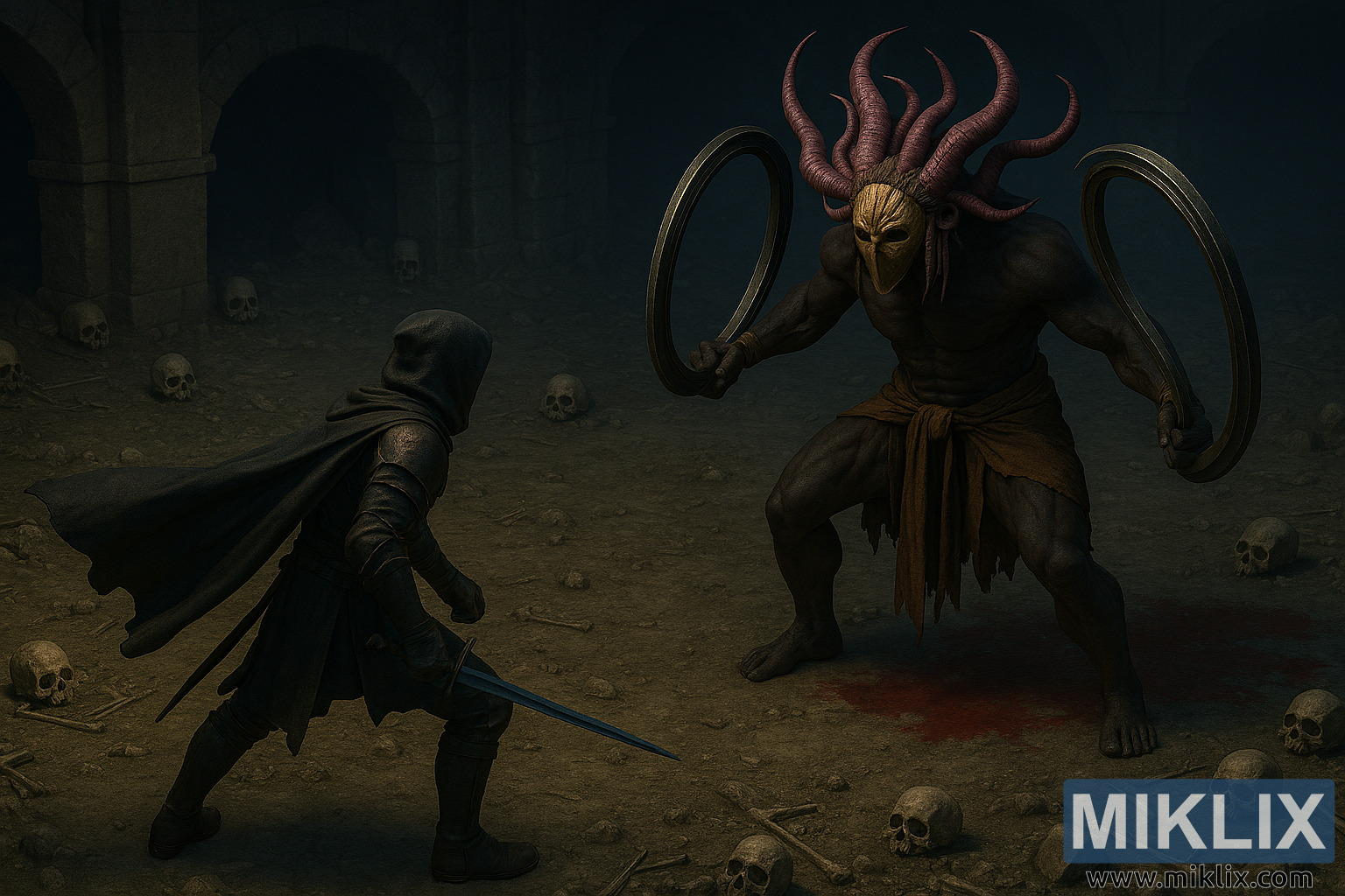 Curseblade Labirith stands towering with a muscular, dark-skinned body. A tattered, brown cloth is wrapped around the waist, hanging down to the knees, and wrists are adorned with faded, frayed wrist bands. The head is adorned with large, sinuous, purple-red horns that curl upwards and outwards. Labirith’s face is concealed by an ornate, gold mask with deep-set, hollow eyes and a stoic expression. The creature wields two large, circular bladed weapons; one in each hand; the metal rings are thick, dark, and sharp. Blood pools at Labirith's feet, staining the ground red.