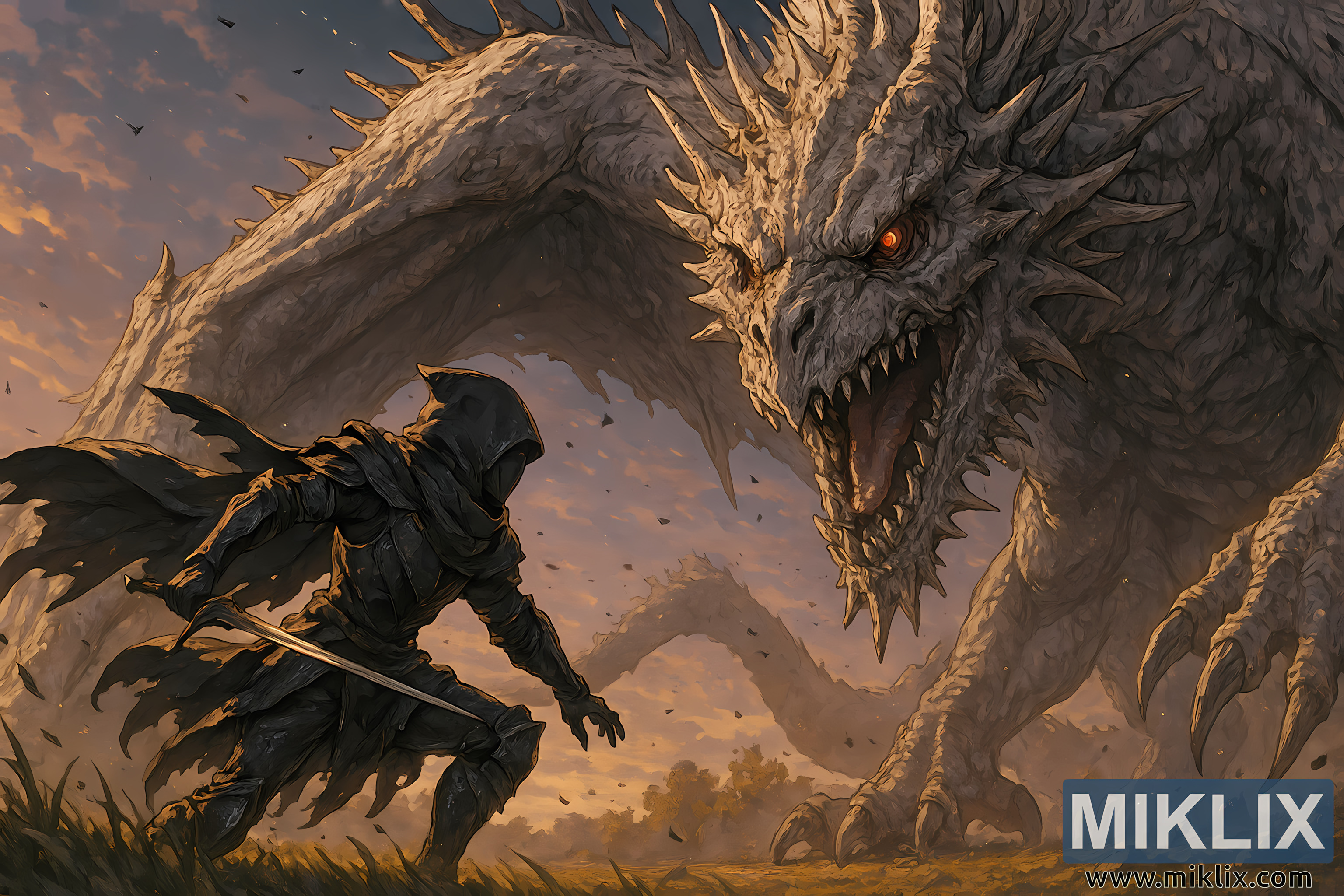 Opposite him looms Elder Dragon Greyoll, dominating the upper right of the image. Her ancient body is massive and scarred, covered in rough, gray-white scales that reflect the fading sunlight. Her head is crowned with broken horns and a bony frill, and her glowing red eyes lock onto the Tarnished with primal fury. Her gaping maw reveals rows of jagged teeth, and her front claw is raised, digging into the earth as if preparing to strike. The dragon’s wings stretch into the background, their tattered membranes silhouetted against the sky.