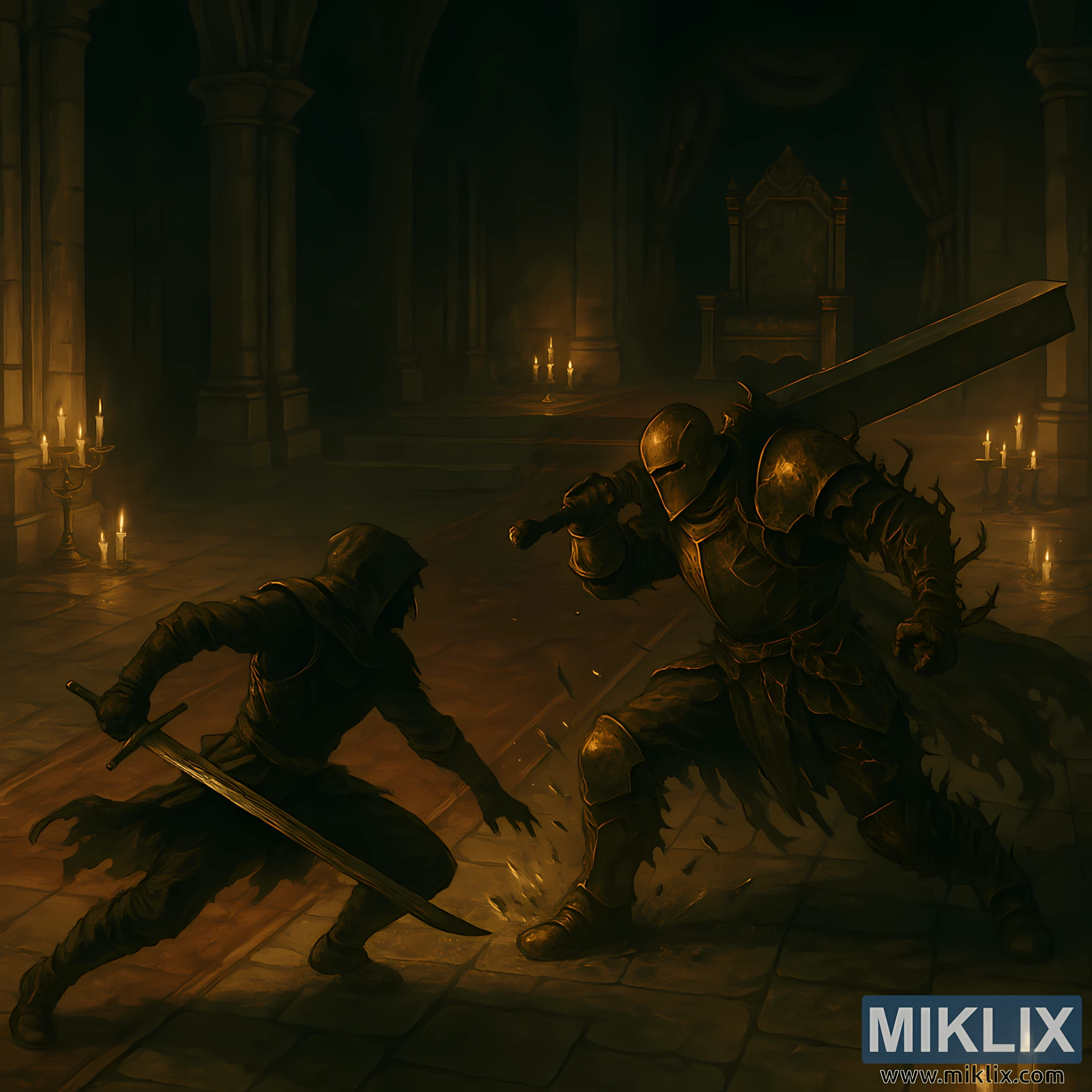 The lighting heightens the sense of action. Candlelight glints off armor edges, blades, and scattered debris, while shadows stretch dynamically across the floor, mirroring the fighters’ movement. The style is grounded and realistic, avoiding exaggerated outlines or stylization. Instead, form is defined through texture, weight, and light. The scene feels frozen at a critical instant of true combat, where both fighters are actively committed to their attacks, and the outcome hangs on timing, distance, and precision beneath the silent gaze of a forgotten throne.