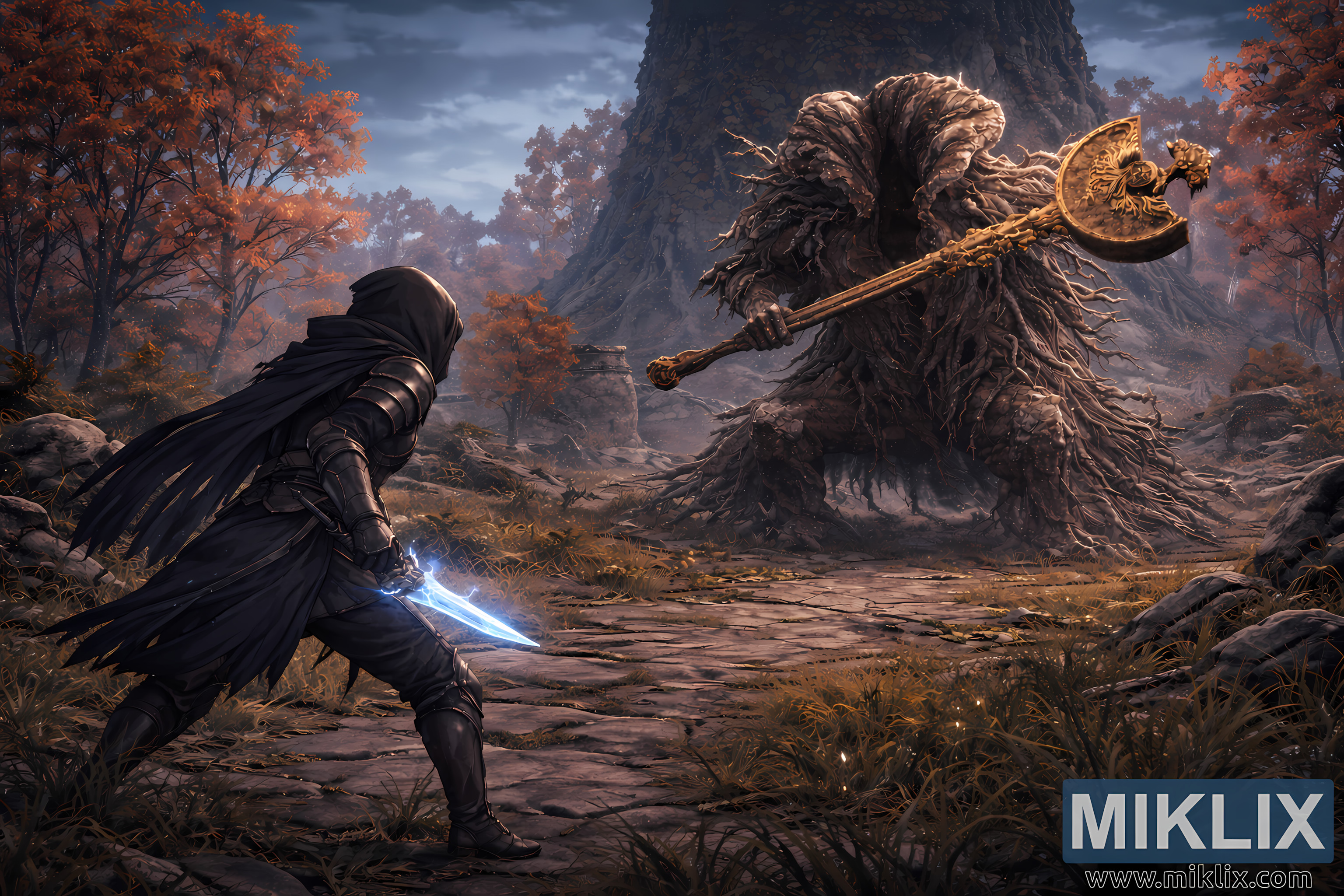 Dominating the mid-ground and right side of the composition is the Erdtree Avatar, now presented as an immense, towering entity whose sheer size dwarfs the Tarnished and even competes visually with the colossal tree trunk rising behind it. The Avatar’s body appears formed from intertwined roots, bark, and ancient timber, its humanoid silhouette both organic and monumental. Thick root-like legs spread outward into the earth, suggesting immovable weight and age. The hollow cavity within its chest resembles a dark shrine carved from wood, adding a haunting spiritual undertone. In its grasp, the creature wields an enormous ornate staff or hammer decorated with circular engravings and tree motifs, the weapon’s scale alone reinforcing the imbalance between the combatants. Despite its intimidating presence, the Avatar’s stance is measured rather than aggressive, conveying a mutual moment of assessment before the inevitable clash.