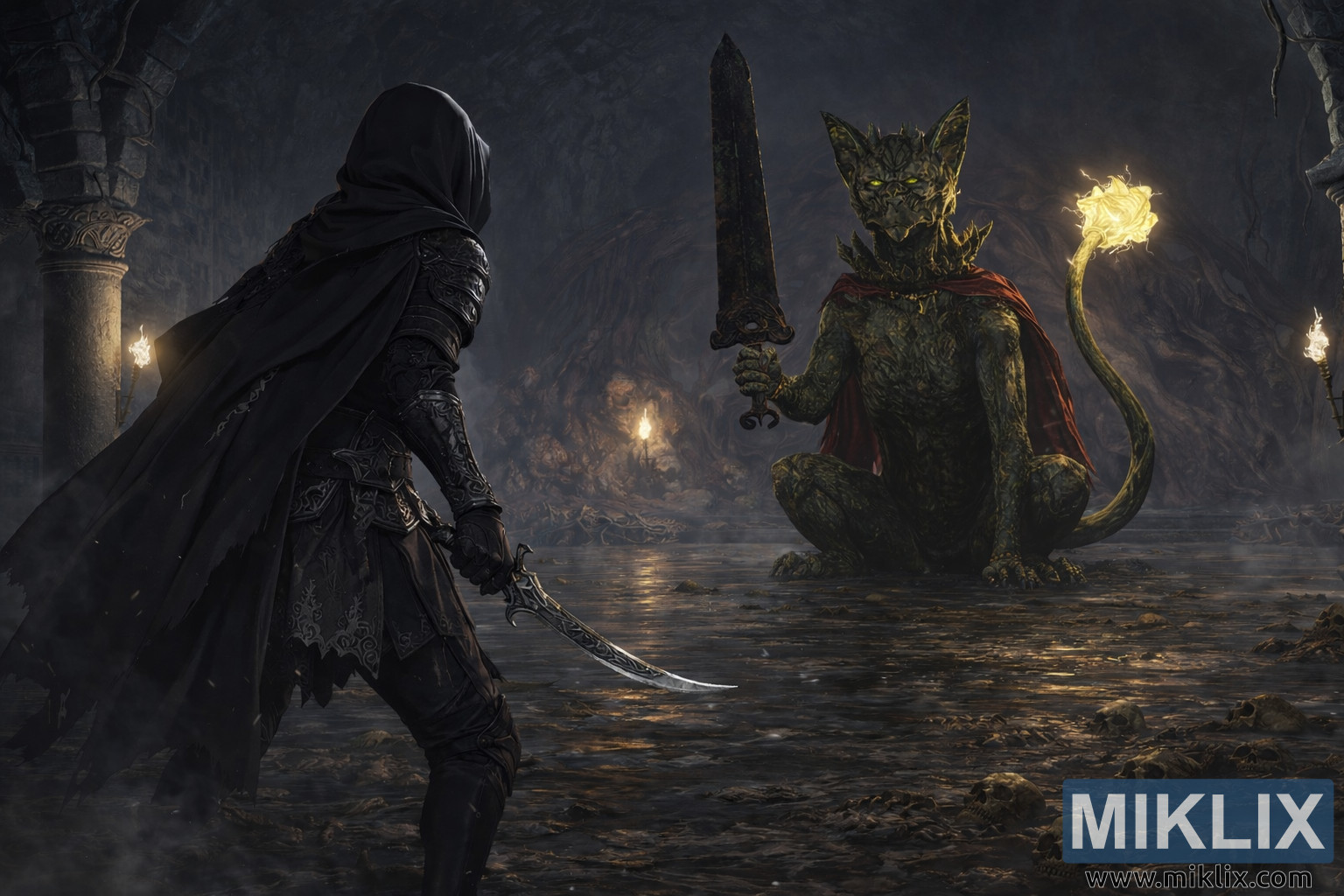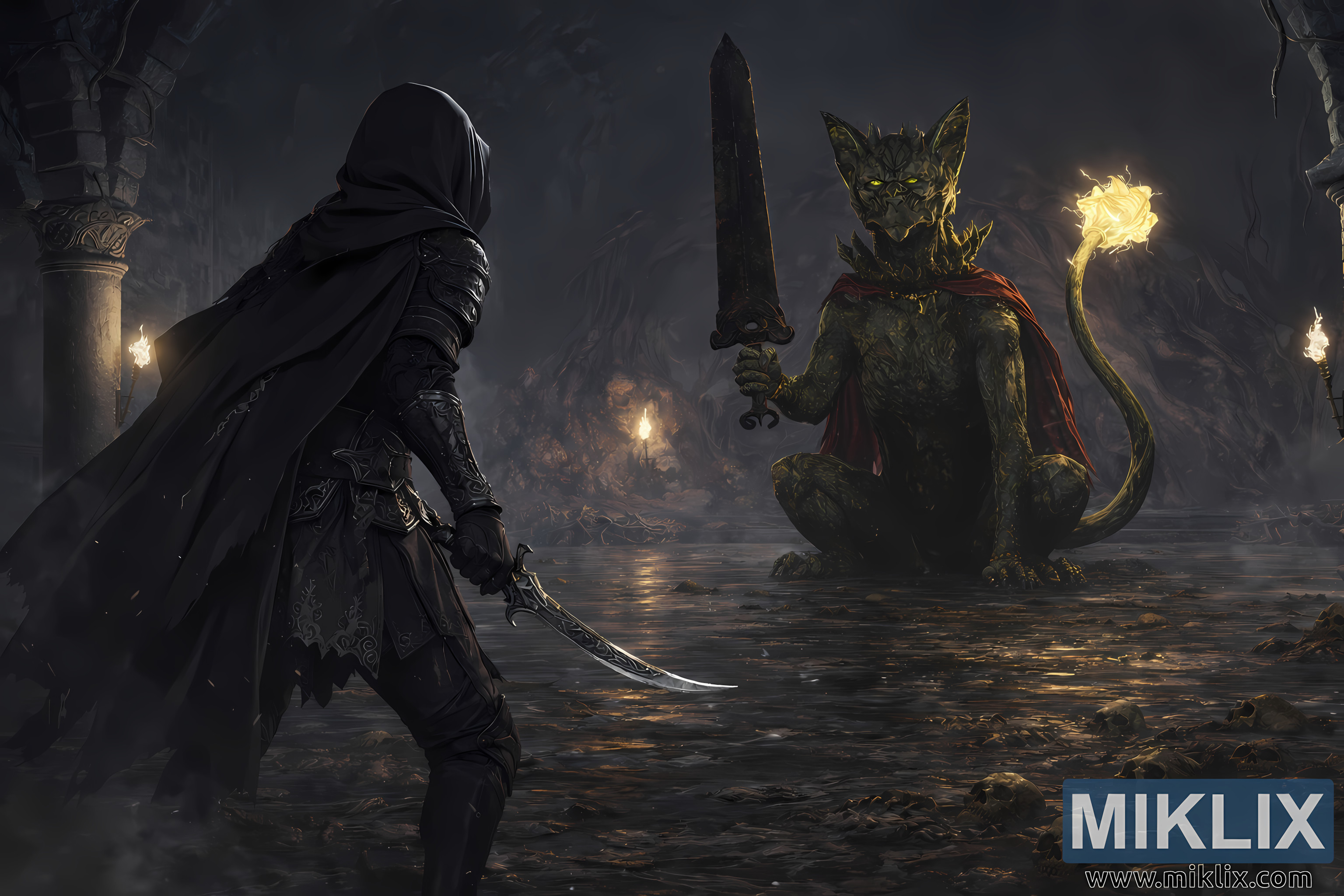 The environment plays a crucial role in the atmosphere. Massive stone pillars rise along the sides of the chamber, their surfaces eroded and etched with ancient patterns. Flickering torches mounted on the walls cast warm orange light that dances across the damp stone, creating shifting shadows that stretch toward the center where the two figures face each other. The floor is partially flooded, and ripples in the water mirror the torchlight and the glowing tail of the Watchdog, adding a shimmering layer of depth and movement to the otherwise still confrontation. Scattered bones and fragments of broken masonry rest beneath the water’s surface, subtly hinting at past battles and forgotten travelers.