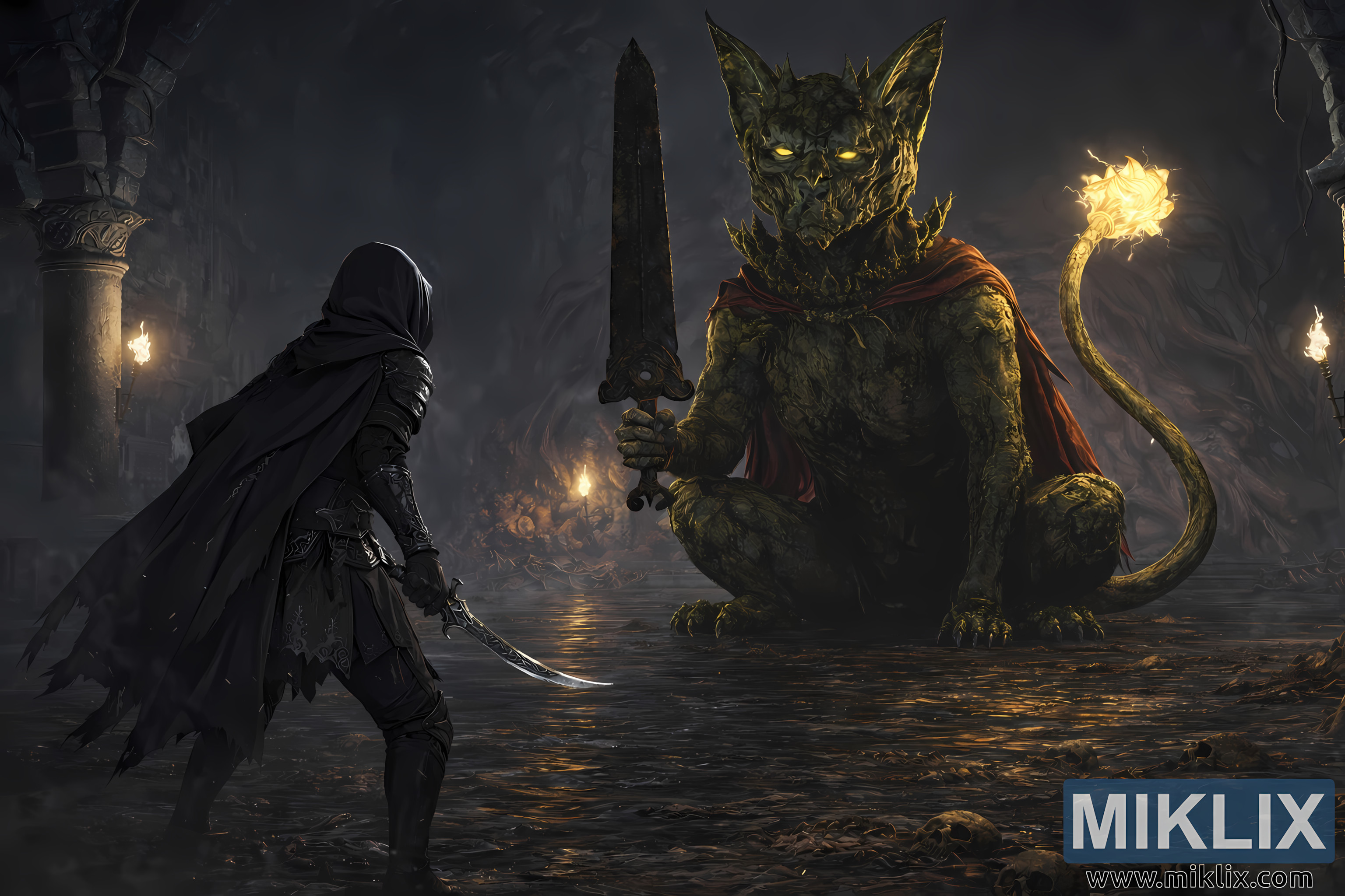 The environment deepens the sense of unease and grandeur. Towering stone pillars line the sides of the catacomb, their surfaces eroded and etched with forgotten patterns. Flickering torches mounted along the walls cast warm orange light that dances across damp stone textures, producing long shifting shadows that converge toward the center where the two figures face each other. The floor is partially submerged in dark reflective water, and subtle ripples distort the mirrored images of the Tarnished, the Watchdog, and the surrounding lights. Beneath the surface lie scattered bones, broken masonry, and remnants of past explorers, quietly suggesting the history of danger embedded within the chamber.