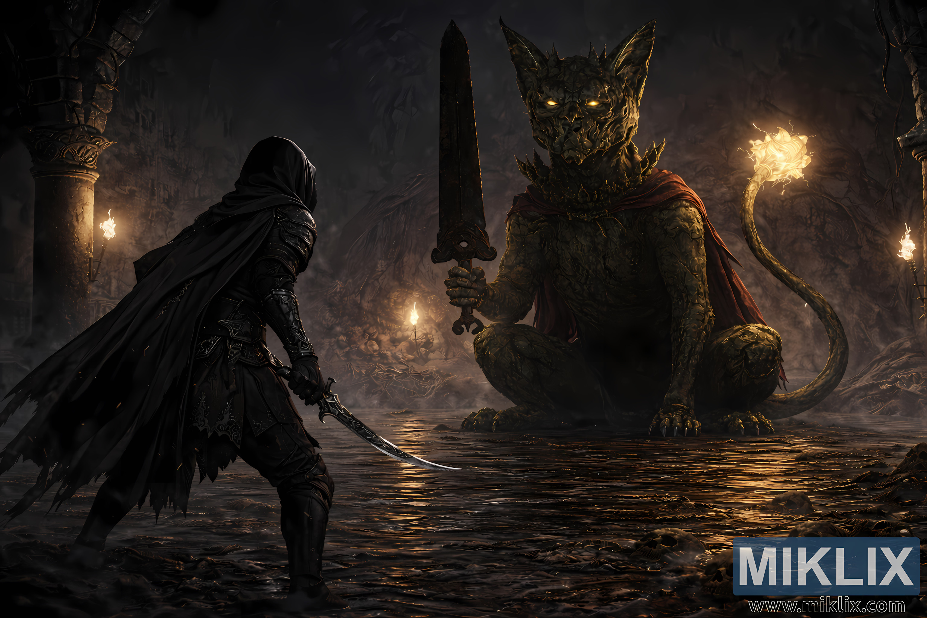 The surrounding environment intensifies the atmosphere of solemn danger. Towering stone pillars line the edges of the chamber, their surfaces eroded and inscribed with indistinct patterns lost to time. Wall-mounted torches emit warm amber light that flickers across damp stone walls, creating layered shadows that stretch toward the center of the scene. The floor is partially submerged beneath shallow water, producing mirror-like reflections of firelight, armor, and the Watchdog’s glowing tail. Submerged bones, skulls, and broken fragments of masonry lie scattered beneath the surface, hinting at the fate of previous explorers and the long history of conflict within the catacombs.